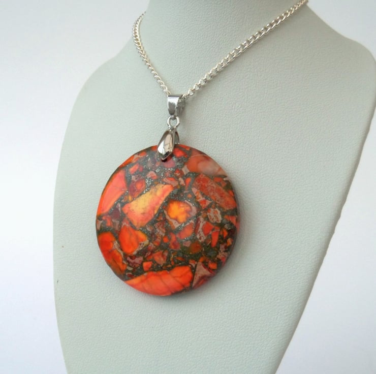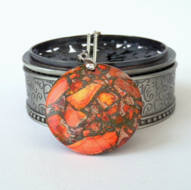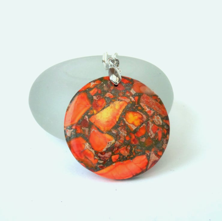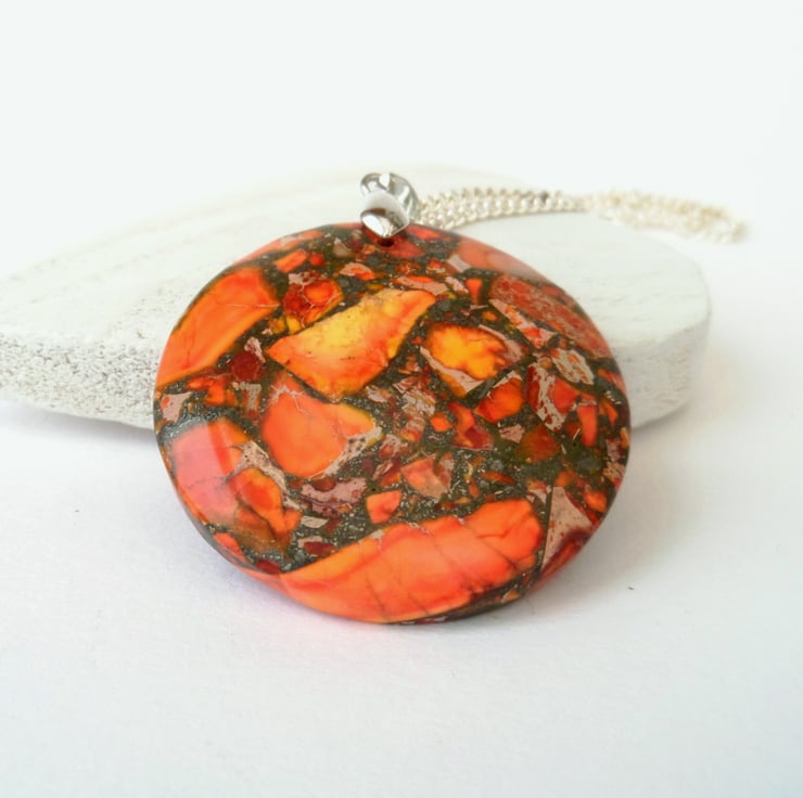 A stunning orange sediment jasper gemstone hangs from a silver coloured bail in this unique pendant necklace.