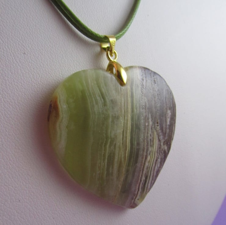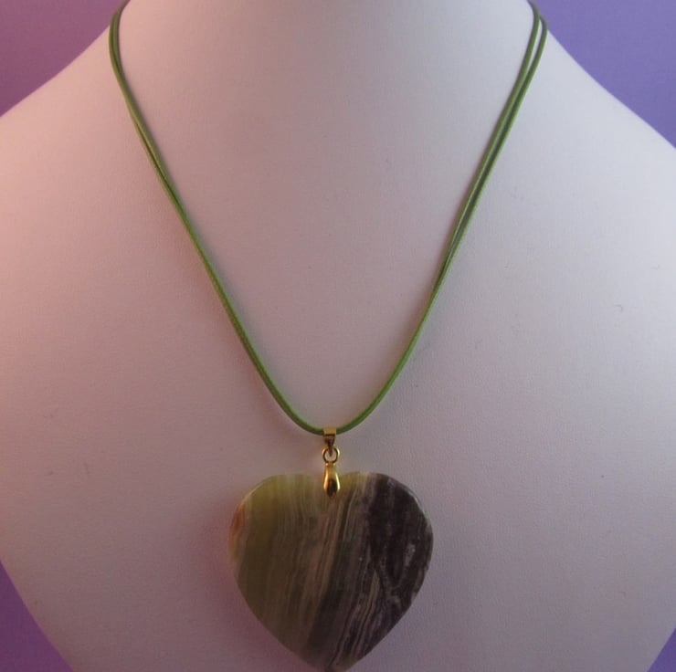 This is a beautiful green striped agate heart pendant necklace. It is created with a real green striped agate heart gemstone, gold plated brass, gold plated copper, yellow waxed cord and a real green agate gemstone on the extender. This is so cute, and would really go with jeans or any casual wear.