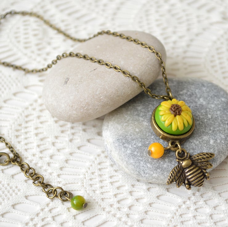 A cute pendant necklace featuring a sunflower cabochon, made completely by hand using an intricate applique technique using polymer clay and finished with a bronze bee charm.