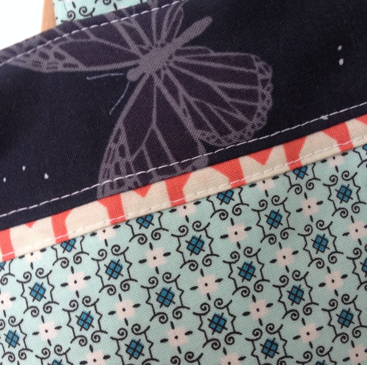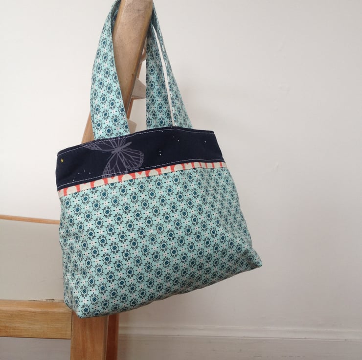 A cute little bag, perfect for toddlers and young ones to fill with their favourite things. Fully lined and interfaced with soft wadding, this is an ideal bag for little ones. Includes a butterfly design on the accent fabric. The fabric is designer 100% cotton from Cotton and Steel. Inner lining and wadding are all 100% cotton. Can be machine washed on a wool cycle. Measures 10 inches by 8 inches and is approx 3 inches deep.