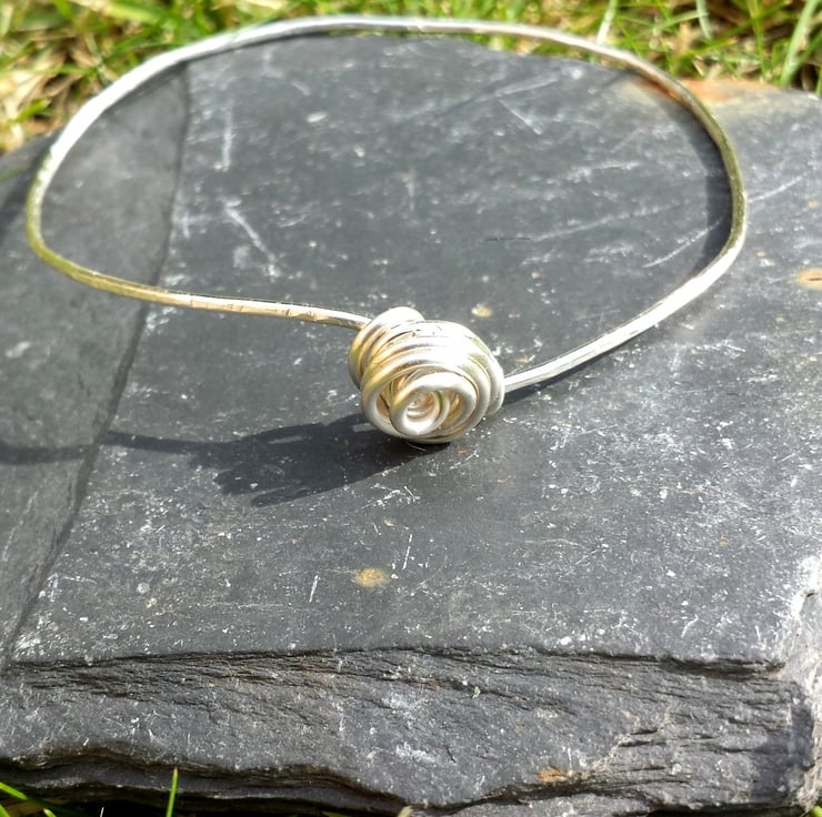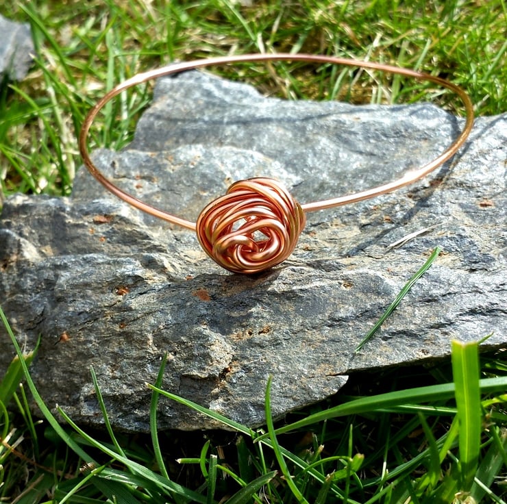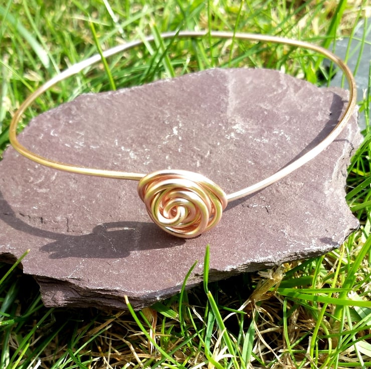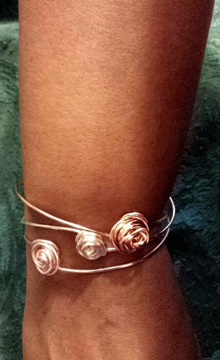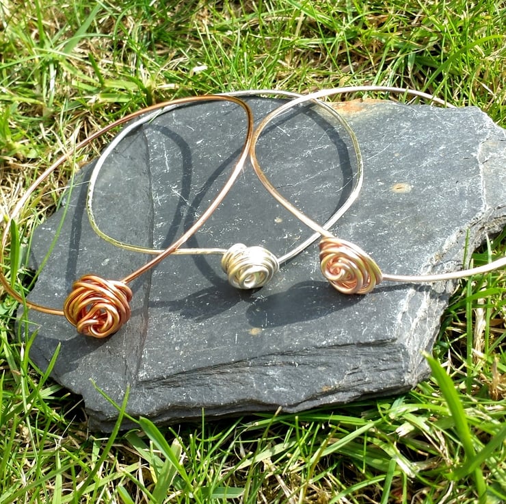 This is trio of Rosebud Design Bangle Bracelets. Of the three bracelets, one is made from Rose Gold plated wire, the other is made from copper wire and there is one made from silver plated copper wire.