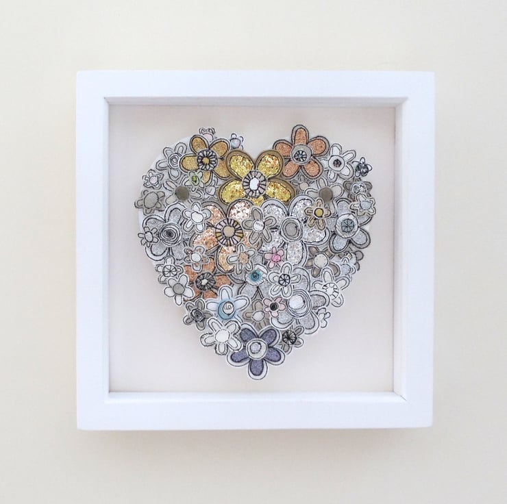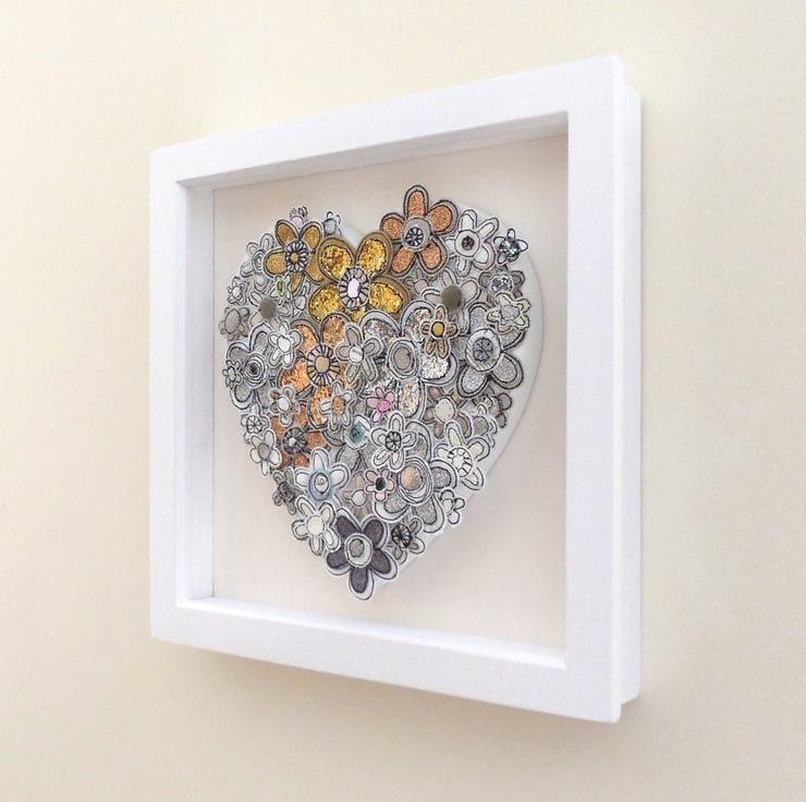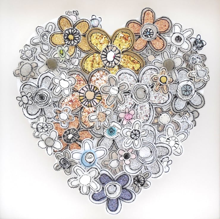 A framed picture of a painted heart shape, adorned with free hand machine embroidered flowers, which are all cut out by hand. The box frame measures 24cm x 24cm and 3.5cm deep and is painted white.