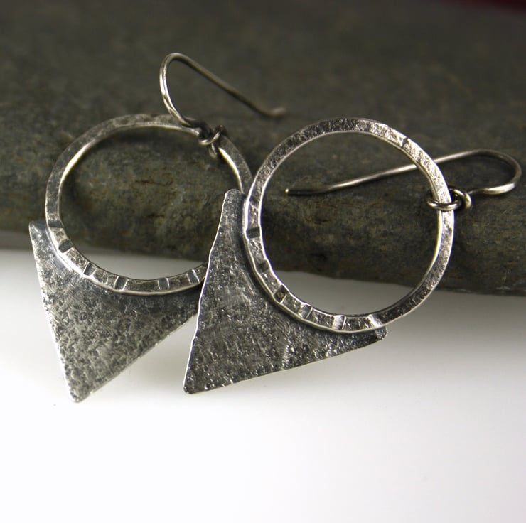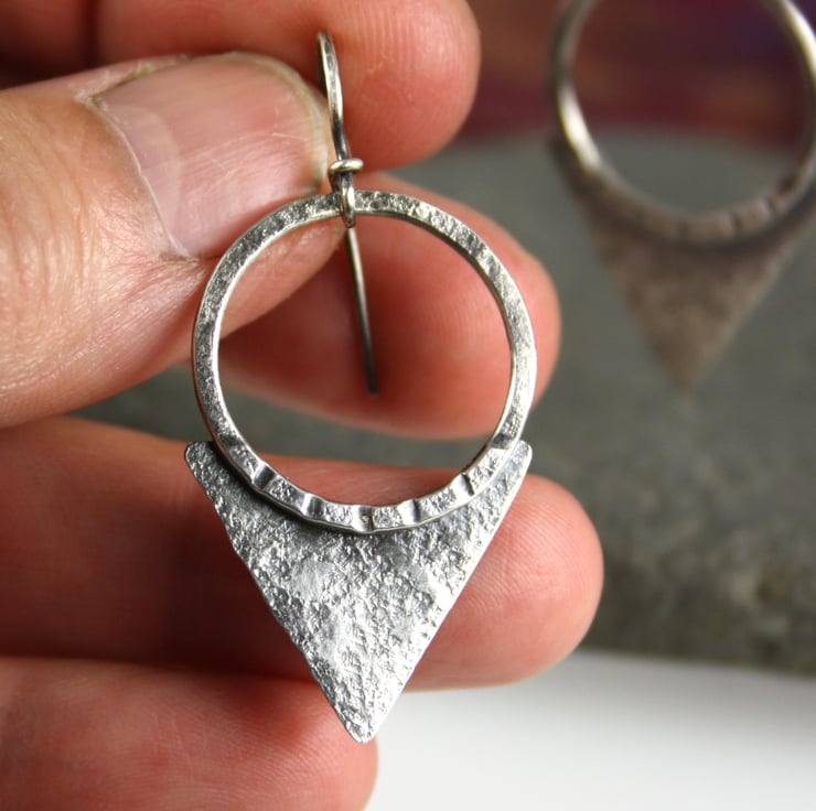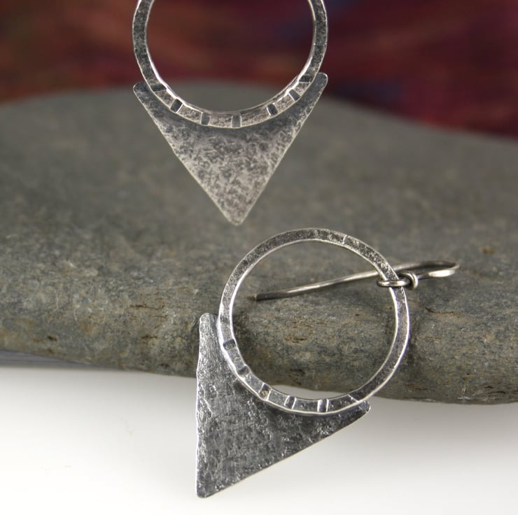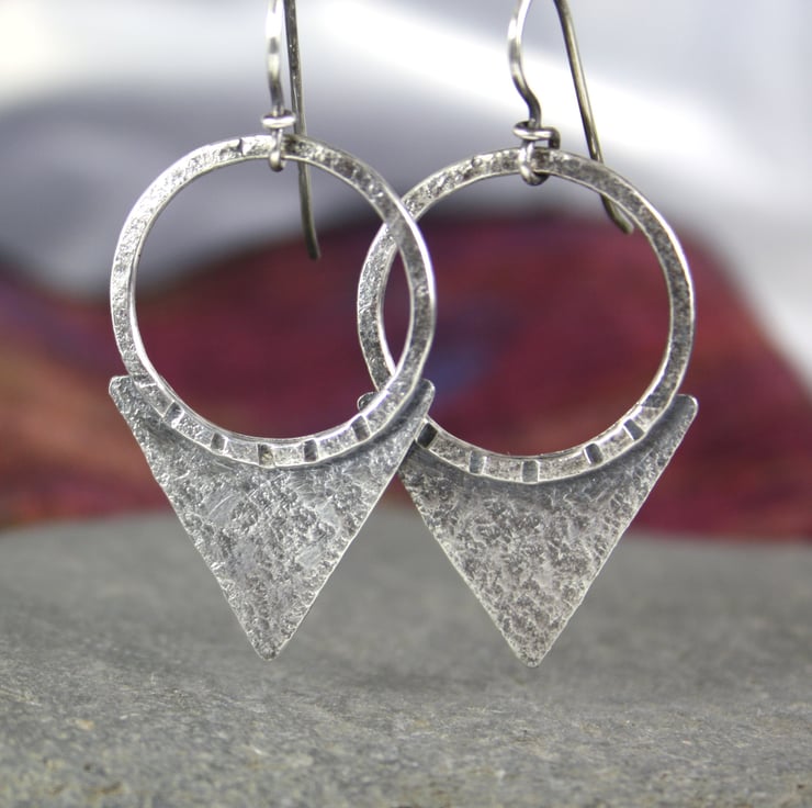 These large silver triangular earrings have been beaten for pattern and texture and then oxidised to darken the recesses . The metal has been rubbed with wirewool for a subtle matte shine.