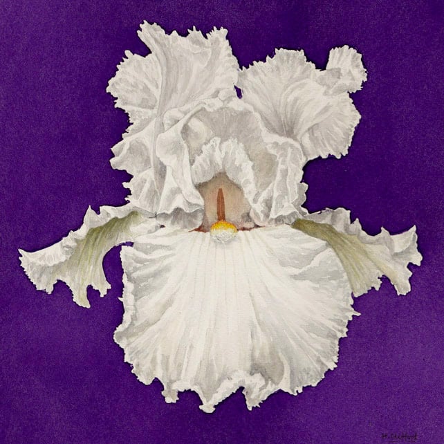 This is a unique original watercolour painting of a white iris flower on a deep purple background which shows to perfection all the tiny frills and flounces in the pure white petals. In the centre of the bloom, a bright yellow stamen is a focal point that draws the eye.