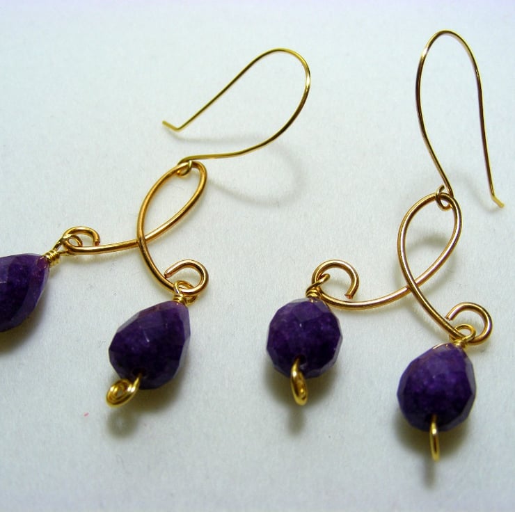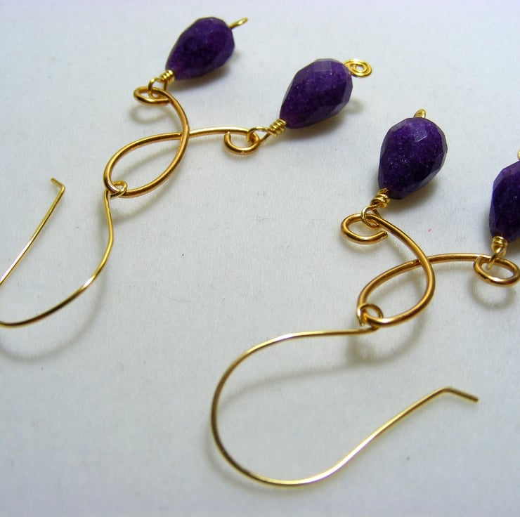 I have made these earrings using 12 x 8 mm dyed purple jade semi precious gemstone drops which are wrapped on handmade headpins and attached to handmade connectors.