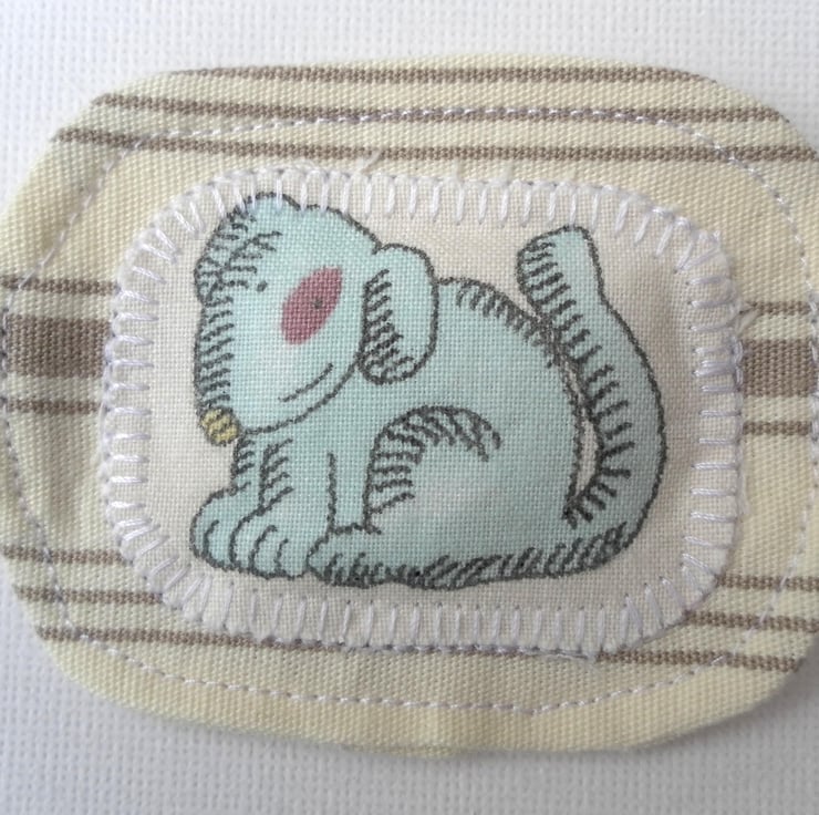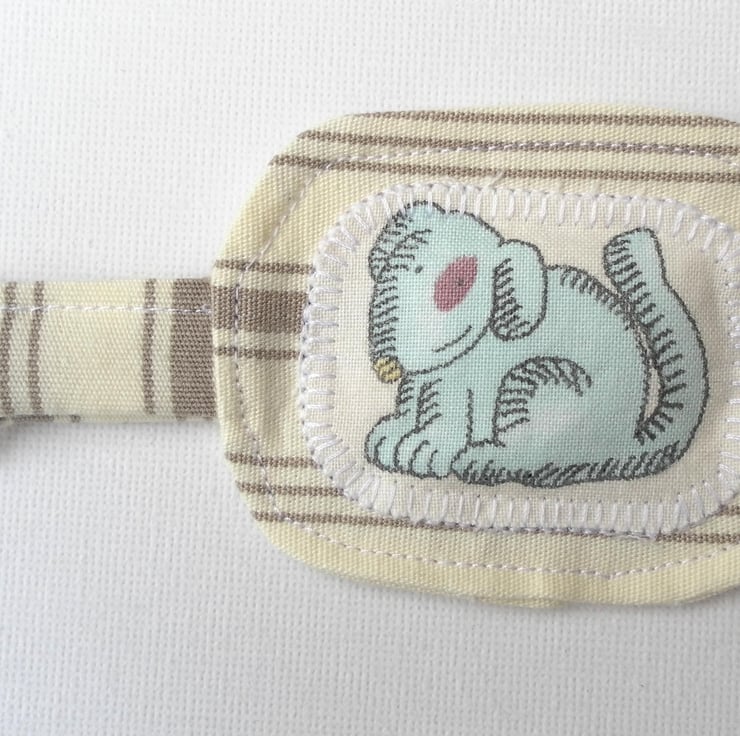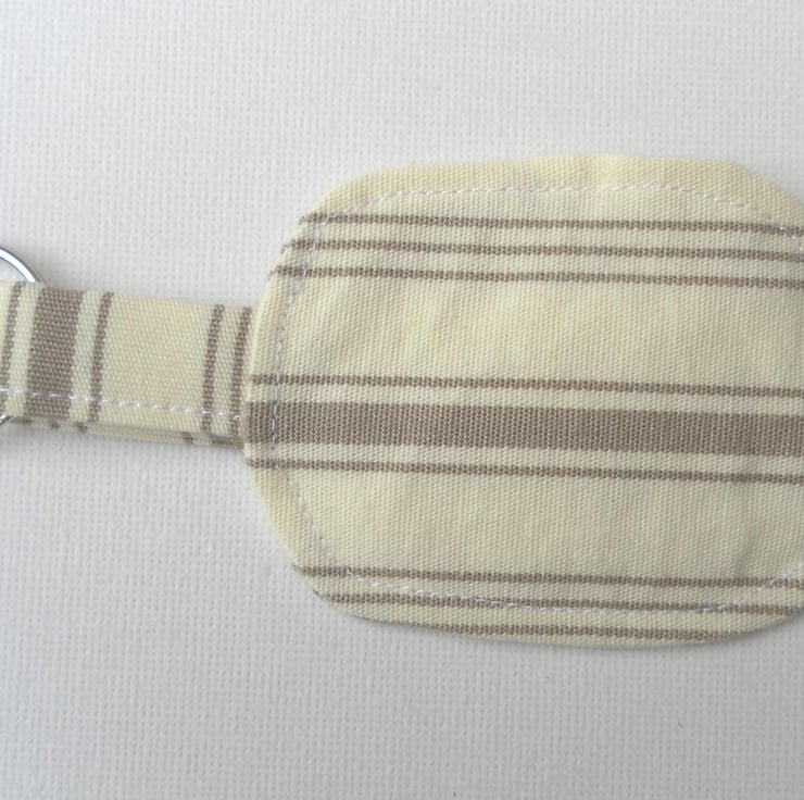 This sweet keyring has an appliquéd, blue dog motif on a tab of beige striped fabric with a tag and split ring for keys. It measures approximately 7.5cm x 6cm and is lightly padded behind the cat. All the fabrics, except the padding are up-cycled.