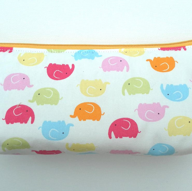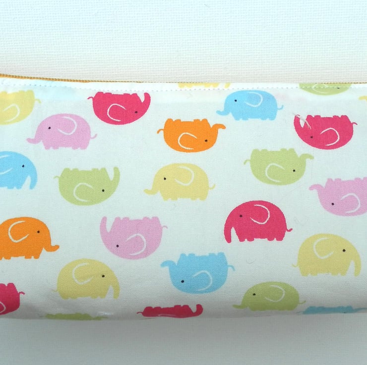 This pencil case or make up bag is made from a pretty cotton fabric with multi-coloured elephants on an off white back ground. The bag is lined with cream cotton, lightly padded and it has a yellow zip. The bag measures approximately 20cm x 10cm and the bottom corners are squared off.