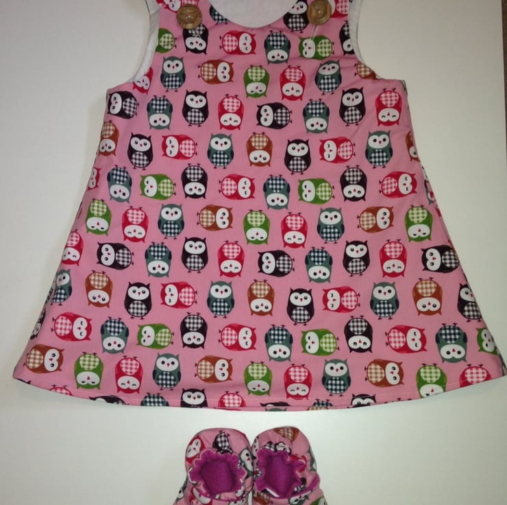 Gorgeous pinafore dress set made from beautiful Printed cotton , fully lined and finished off with natural wooden buttons. Teamed with beautiful matching fleece lined booties.