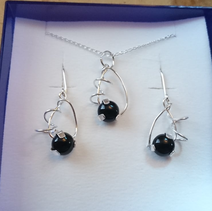 Hand made sterling and onyx tear drop necklace on an 18" chain and in a gift box. Matching items available, gemstones vary due to nature. Other gems available on request.