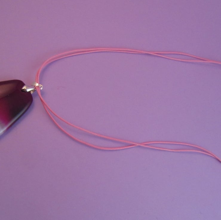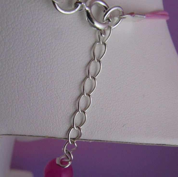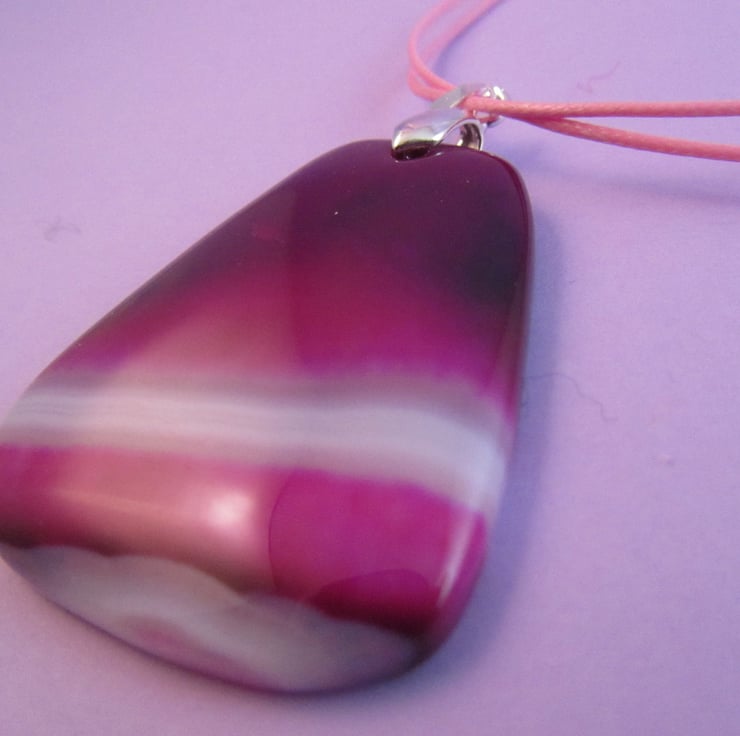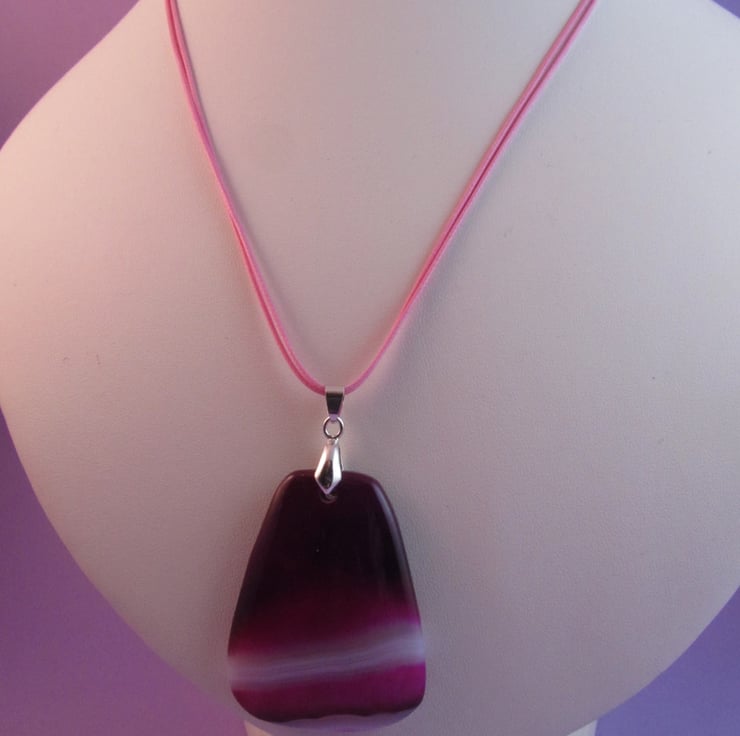 This is a pretty pink agate pendant necklace. It is created with a real pink agate gemstone, silver plated brass, silver plated copper, pink waxed cord and a real pink agate gemstone on the extender. This would really go with jeans or any casual wear.