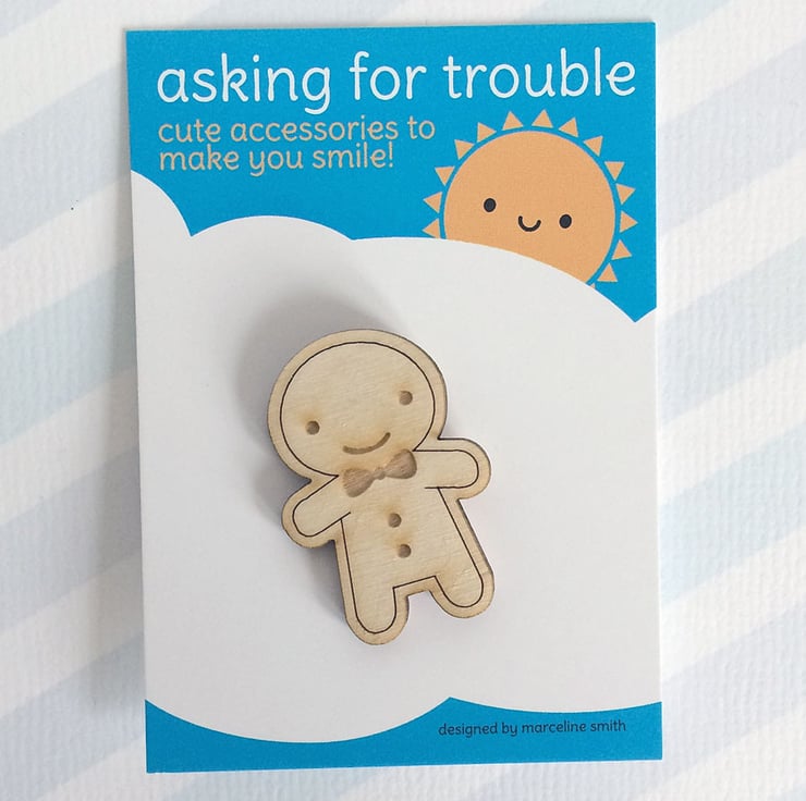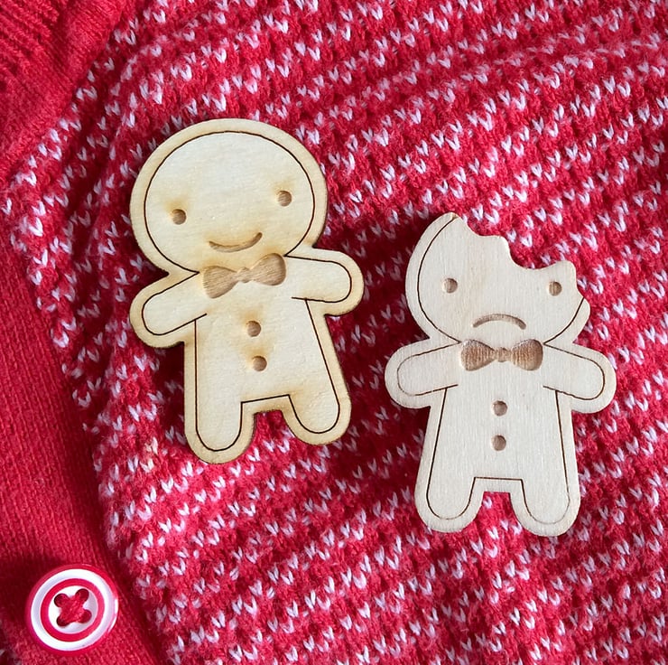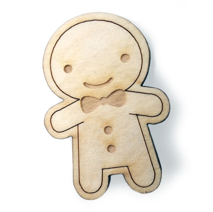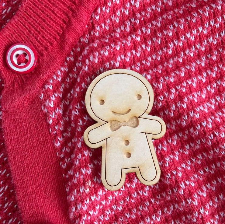 This happy little gingerbread man is ready for Christmas celebrations and for every day throughout the year. Laser cut from Birch Plywood to my design with laser-engraved details of icing, bowtie and buttons. A brooch pin is attached securely on the back so he can come everywhere with you, on your coat or bag!