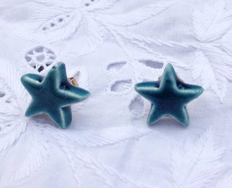 Small ceramic star stud earrings - Peacock Green - Sterling silver posts and scrolls