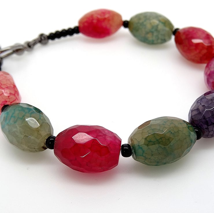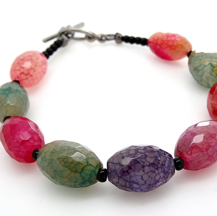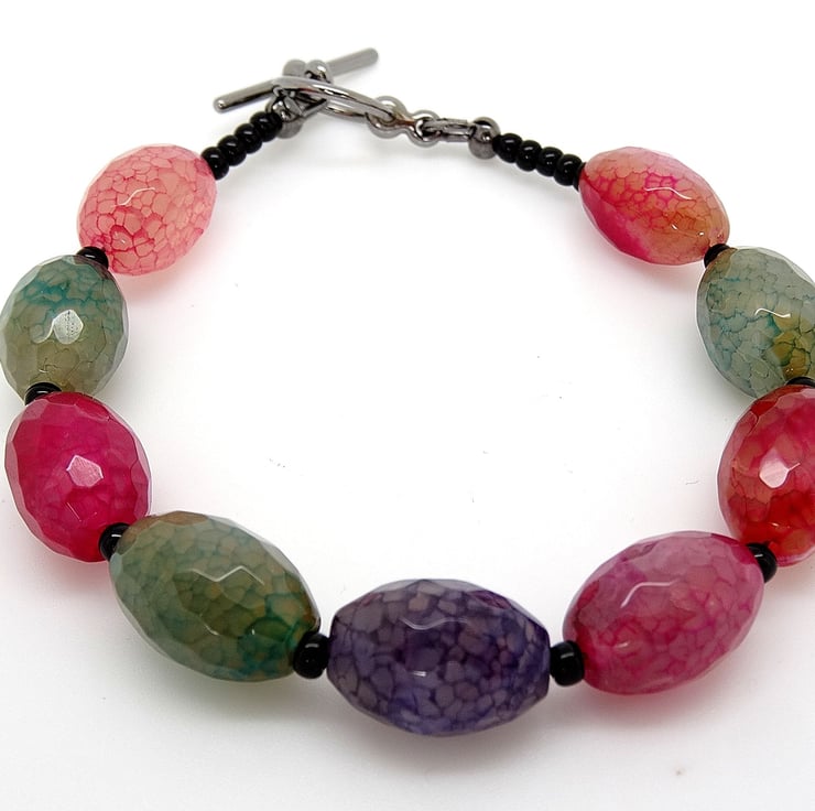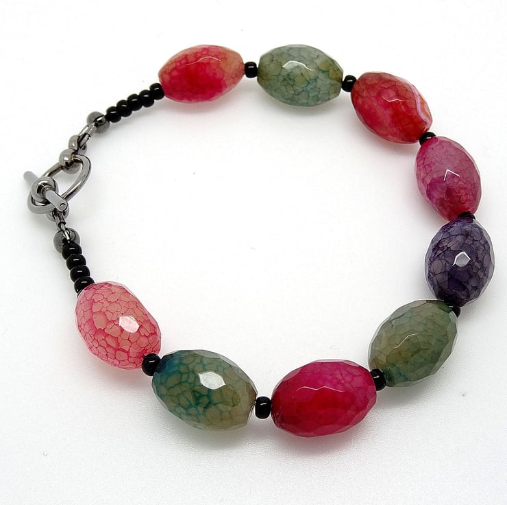 This is a lovely bracelet made with 15mm faceted cracked agate oval beads. This bracelet is so pretty, the colours of the agate are fuchsia, pale green, lavender and pale pink which are interspersed with tiny black glass seed beads. The bracelet measures 8" (20cm) and is finished with a gunmetal plated toggle clasp. As all of the items in my shop are unique, individual pieces made by myself, this is the bracelet you will receive. It will arrive gift wrapped in tissue paper and a organza bag.