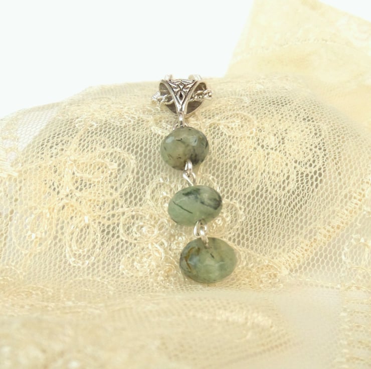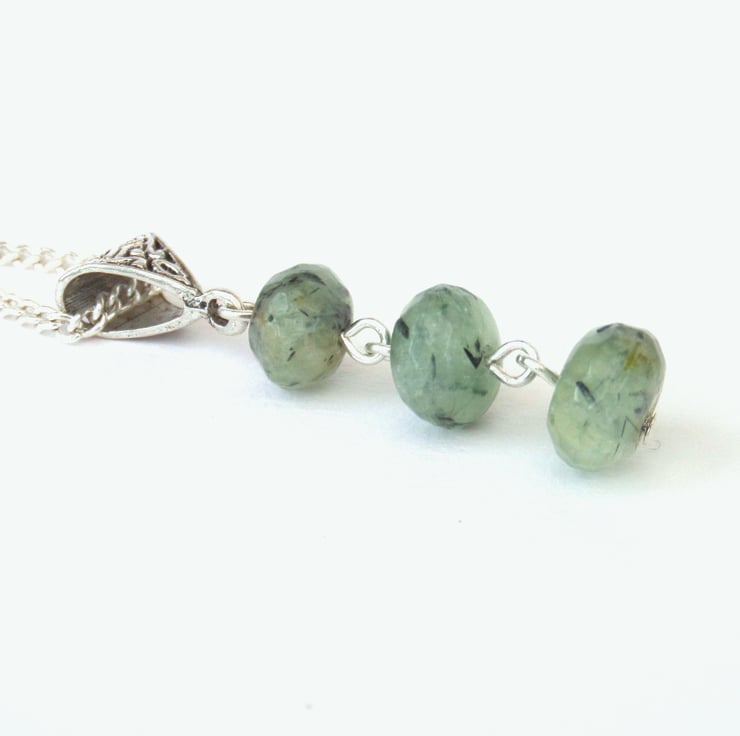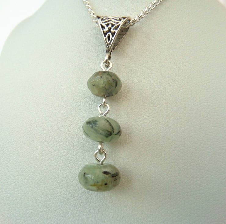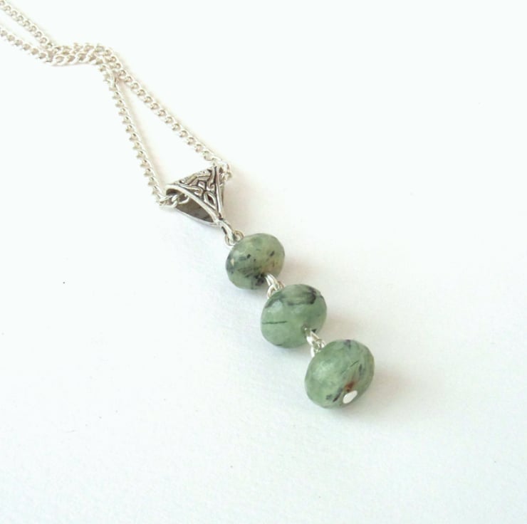A dainty necklace, made with three prehnite semi-precious gemstones.