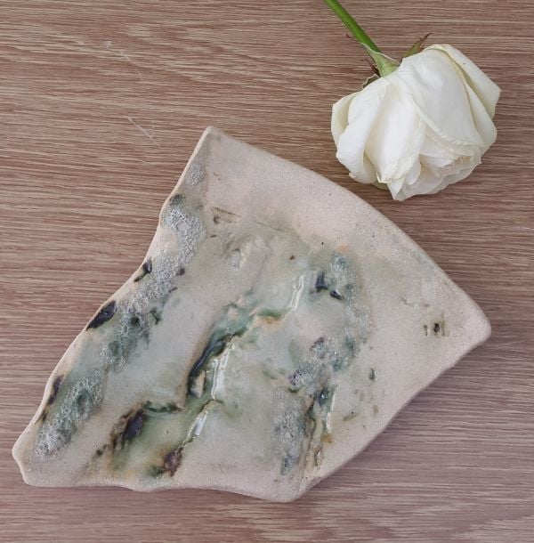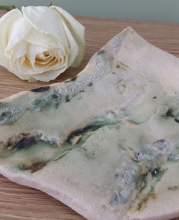 Handmade stoneware ceramic soap dish with a beautiful natural pattern on the surface, highlighted in subtle glossy greens which flow into the crevices, with areas of volcanic crater glaze.