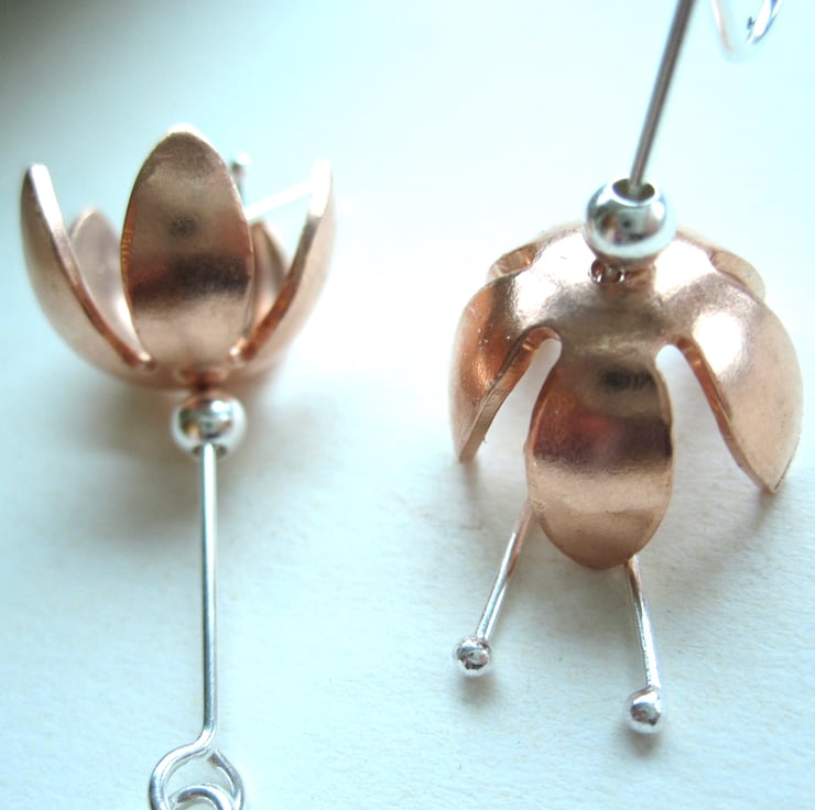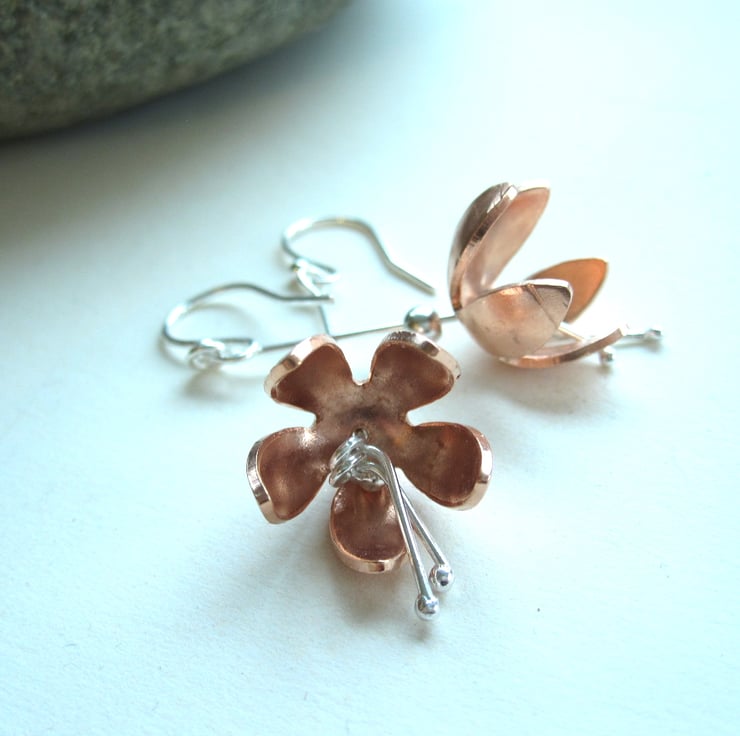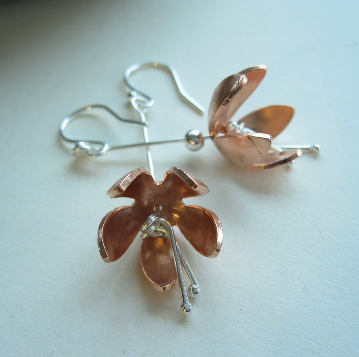 It's stopped raining, and outside is full of golden light, the garden is blooming and the blooms bright, so inspiration struck and I have been making flower jewellery. Copper, gives the flowers warmth, whilst the silver post and backing disc is gentle on even the most sensitive skin.