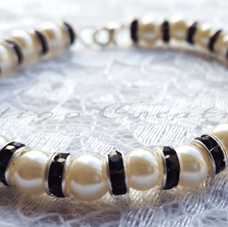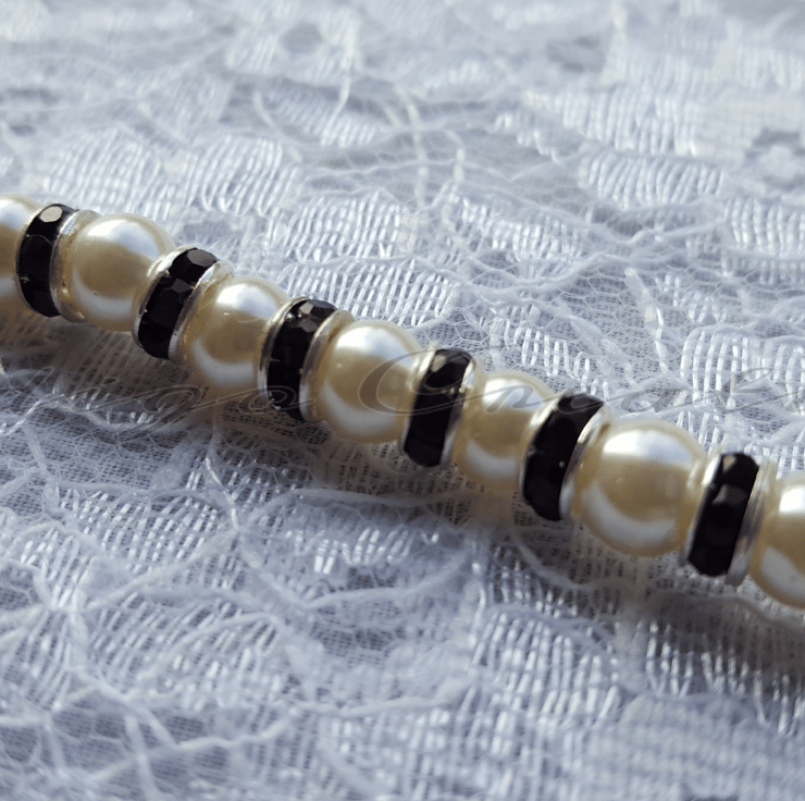 Material: 6mm Ivory Glass Pearls, 6mm Black Crystal Rhinestone Silver Plated Rondelle Spacer Beads, 0.38mm Beading Wire, 10mm Silver Plated Lobster Clasp, Silver Plated Crimp Beads, 5mm Silver Plated Jump Ring.