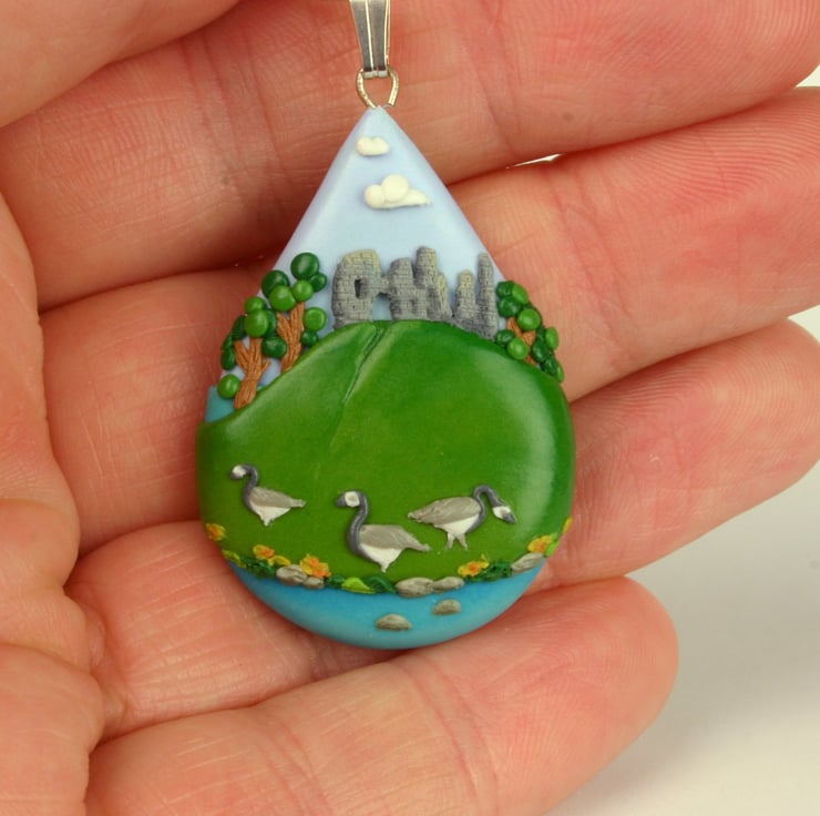 This is a depiction of Newcastle Emlyn's 13th century Castle ruin. I attended secondary school in Newcastle Emlyn and have often enjoyed walking along the banks of the river by the castle. In autumn flocks of geese congregate by the waterside and provide a lovely spectacle!