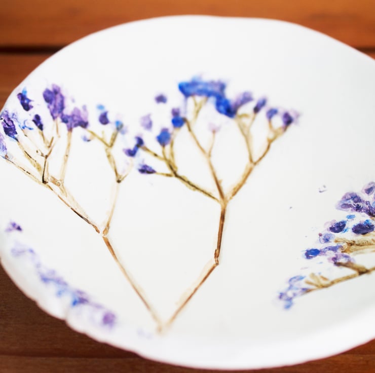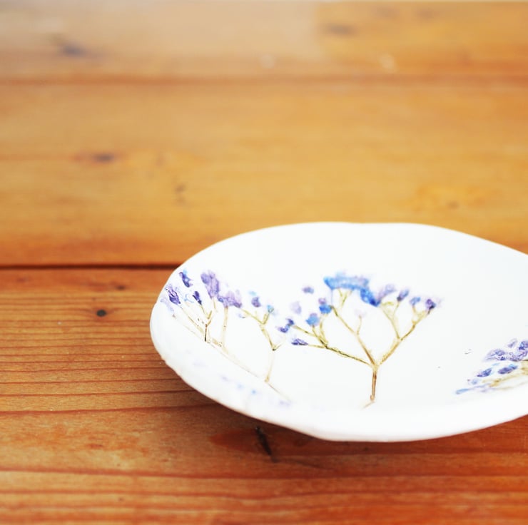 Sweet jewellery dish made with air dry clay, imprinting real flowers before drying and finishing with watercolours and varnished.