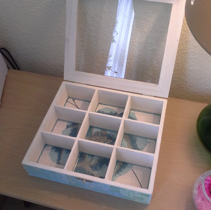 This box has been beautifully hand decorated with a mixture of floral vellum and paper on both the inside and outside of the box and measures approx 8" x 9" x 2.25" in size.