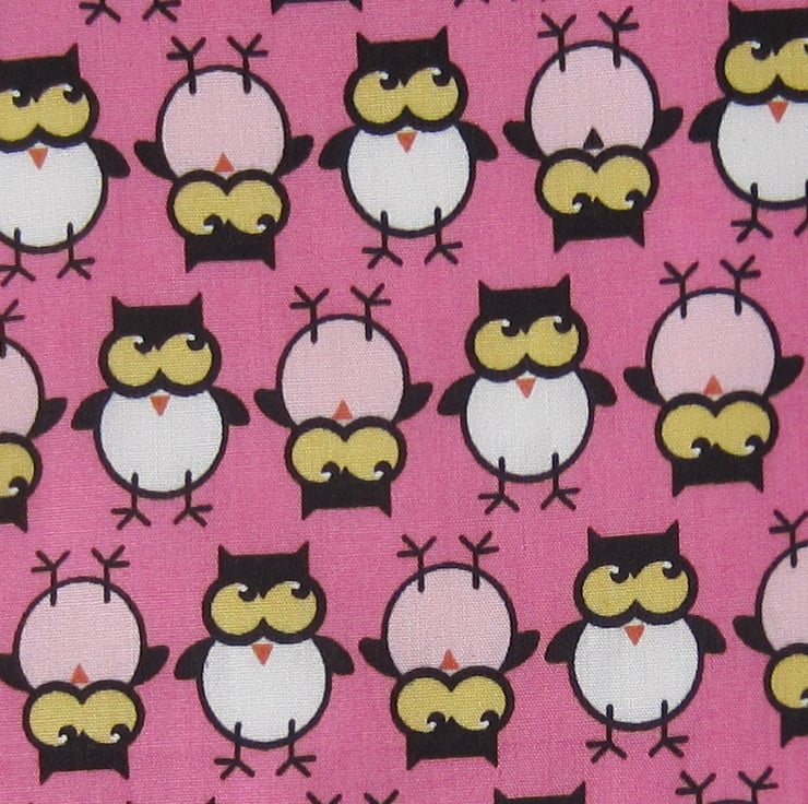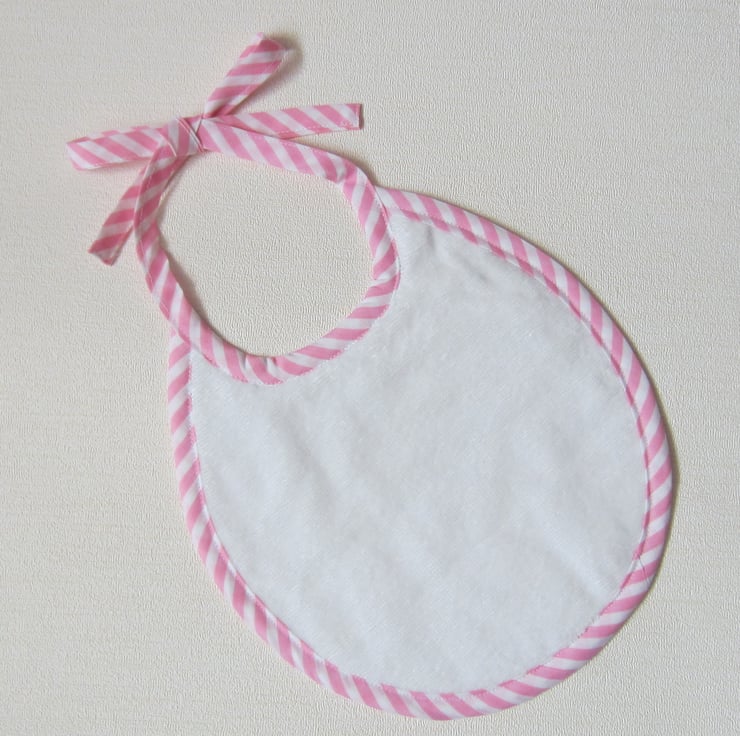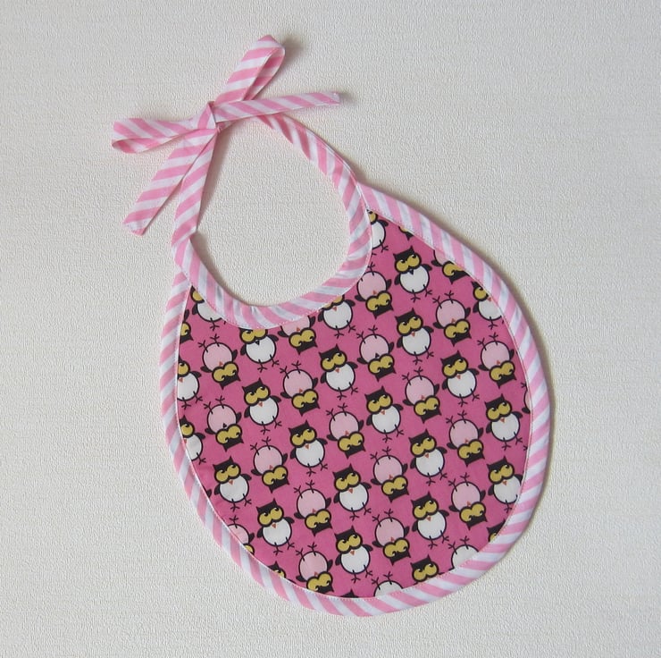 Pretty pink owl first size bib edged with pink and white stripe and backed with a lovely soft white fleece towelling. Suitable for a newborn to a baby aged about 6 months old. It measures 23.5 cm long and 21 cm wide and fastens with a bow at the back of the neck.