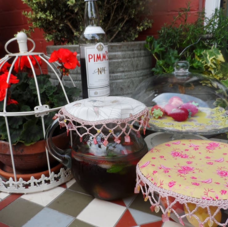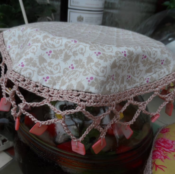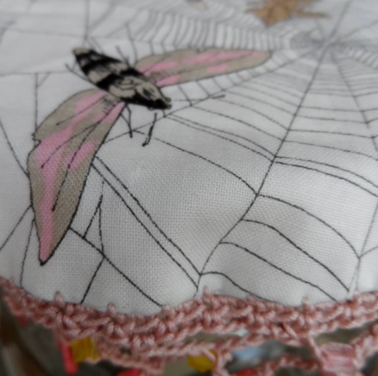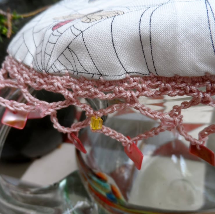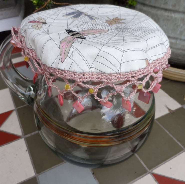 A Reversible jug cover in a Co-ordinating duo of fabrics in a moth and cobweb print. Edged with crochet in a soft cotton yarn and finished with numerous glass beads.