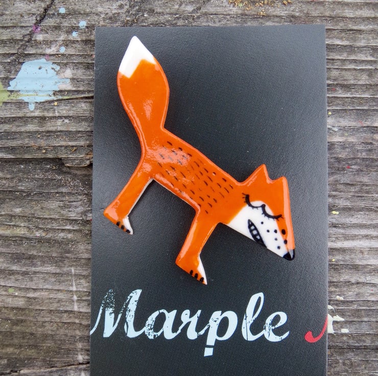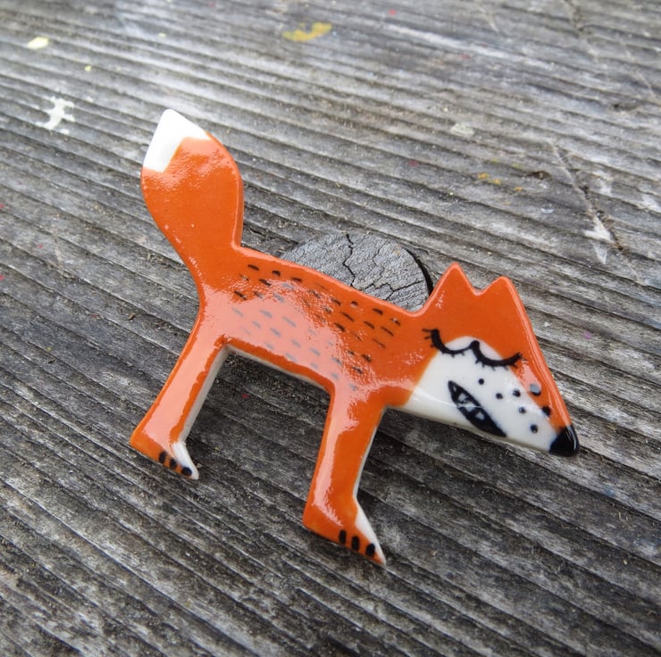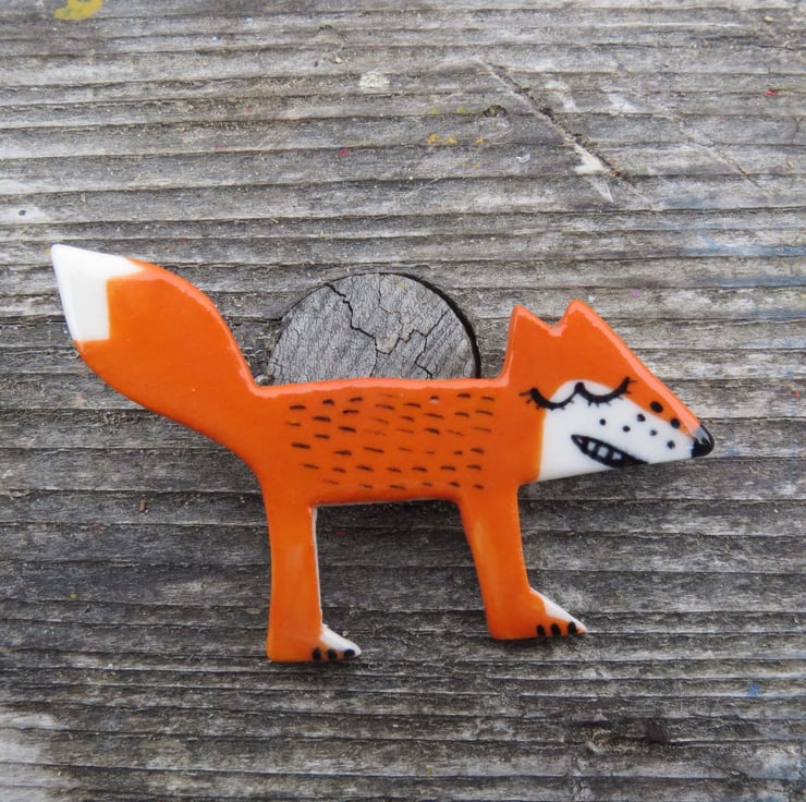 Happy Orange Fox handmade in porcelain.I have hand cut the fox shape around my own template in porcelain,biscuit fired,hand painted and then glaze fired.A silver plated brooch pin is on the back.A one of a kind fun badge for all ages.Measures 6.5 cm by 4 cm.