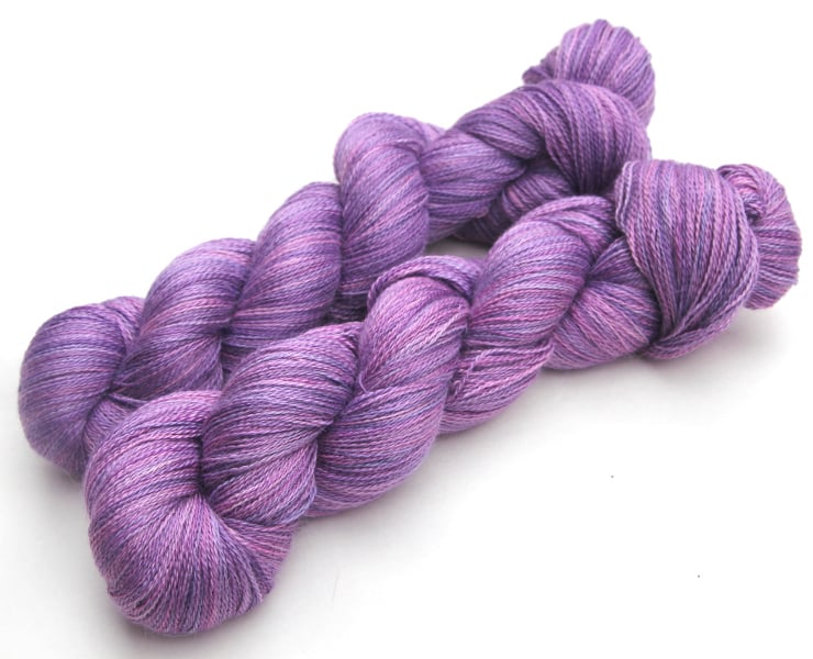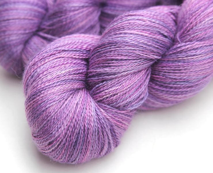 Soft shades of lilac-pink and purple. This gorgeous and luxurious yarn has the softness and warmth of alpaca with the smooth sheen and cool feel of silk. It should make beautiful lace projects. There is one skein left. Photographs have been taken and edited in bright natural light.