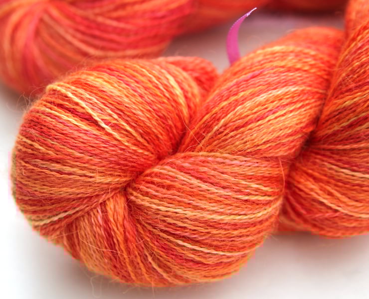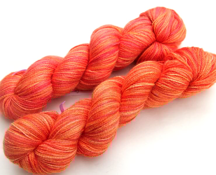 Soft shades of carrot-orange, peach, and softest apricot. This gorgeous and luxurious yarn has the softness and warmth of alpaca with the smooth sheen and cool feel of silk. It should make beautiful lace projects. There are two skeins available (price shown is for one). Photographs have been taken and edited in bright natural light.
