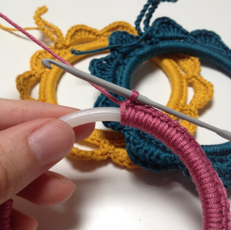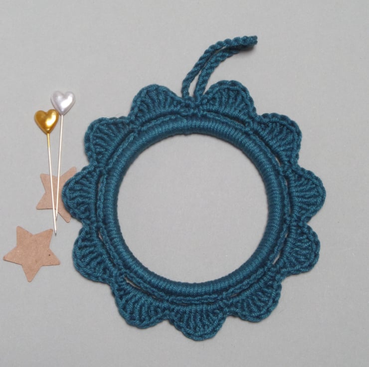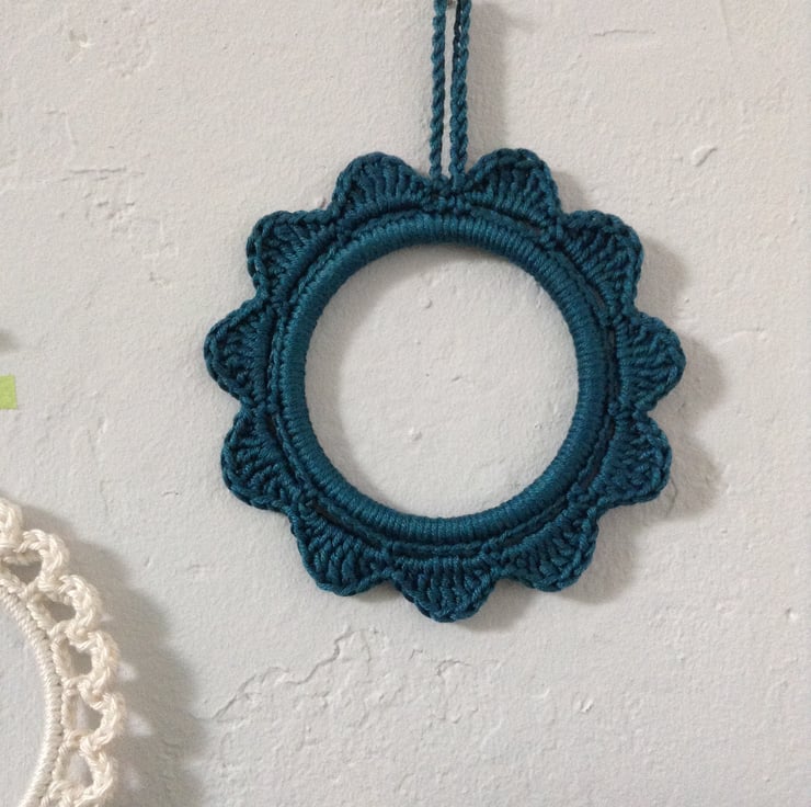 Inspired by beautiful crochet border patterns I had a play around and created this pattern myself! I've crocheted over a sturdy plastic frame with a diameter of 6.5cm with 100% mercerised cotton and added a little hanging loop.