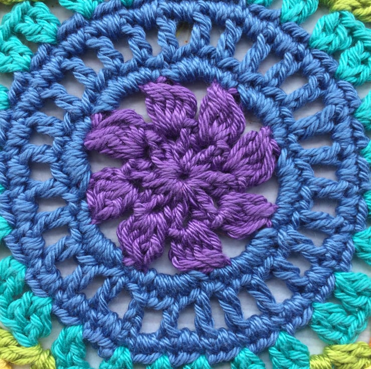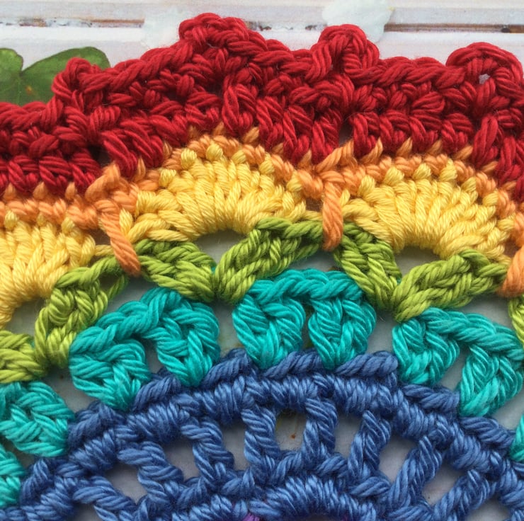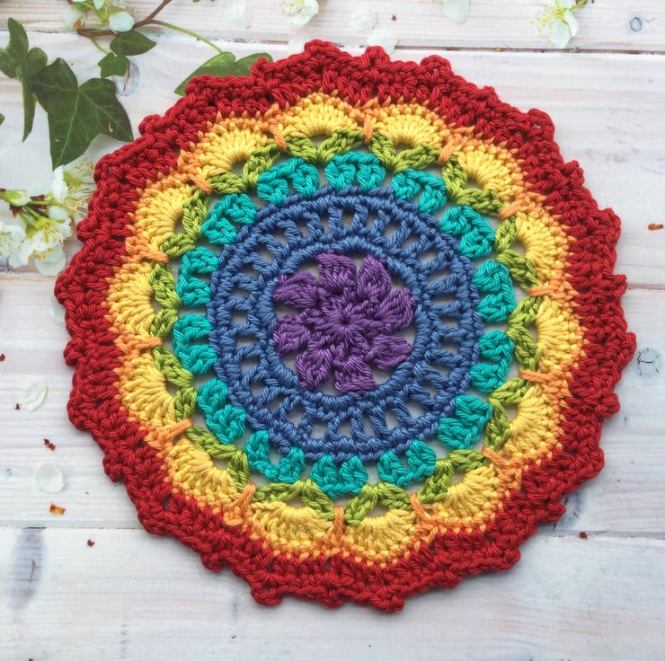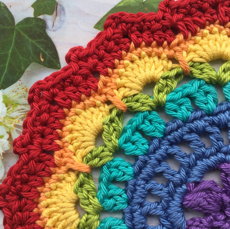 Crocheted Mandala style table mat in the seven colours of the rainbow.