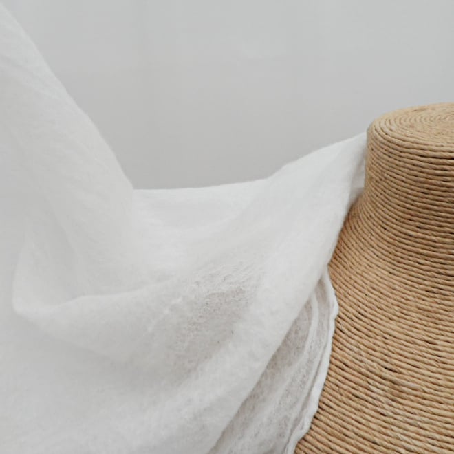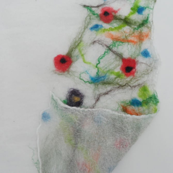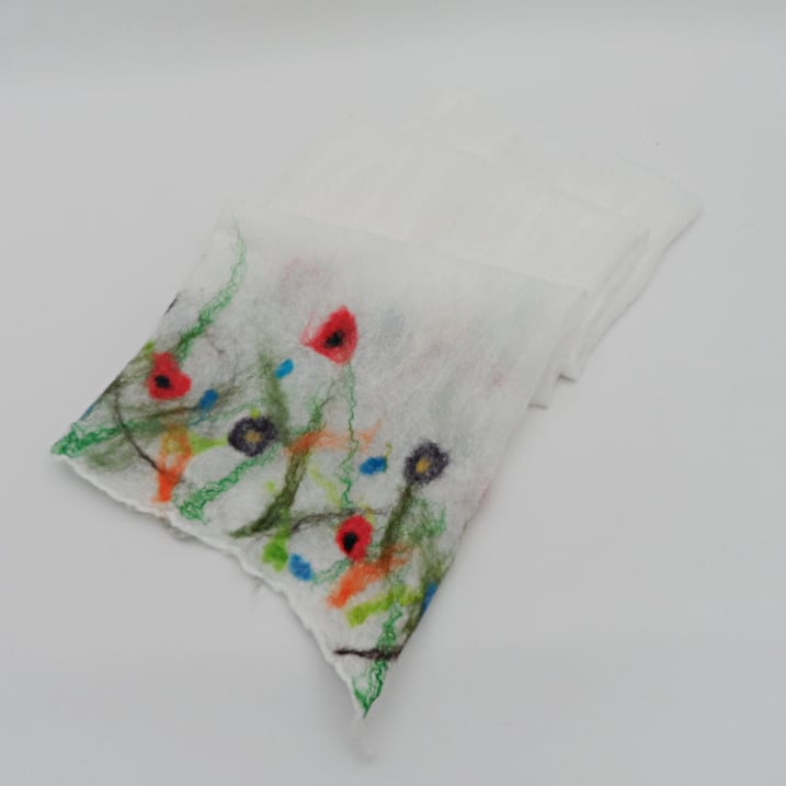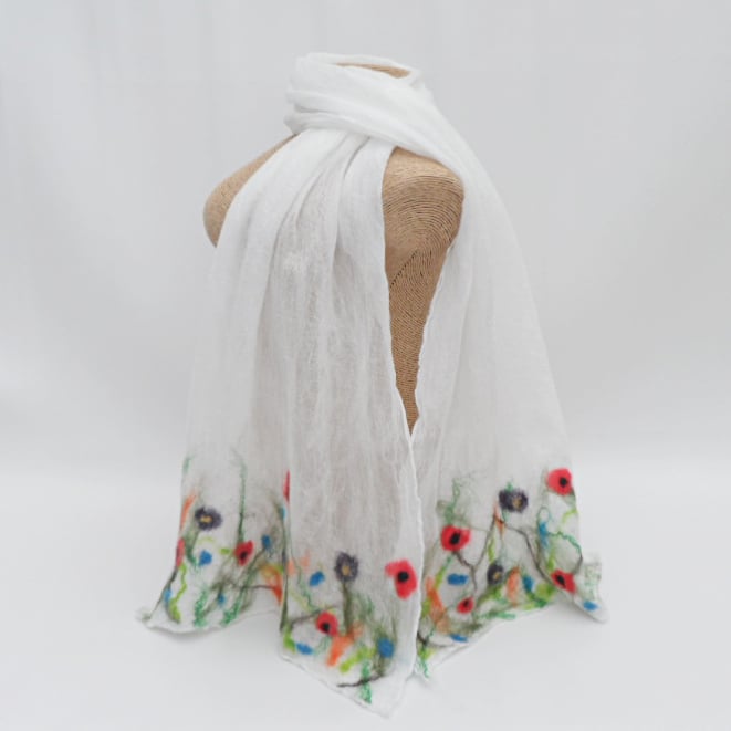 This beautiful scarf has been made using the nuno felting technique. A very fine layer of white merino wool has been laid over a white silk chiffon scarf and a floral decoration at each end has been added using various wool and silk fibres. The scarf was then nuno felted which allows the wool fibres to migrate through the silk and bind with it to produce a gloriously light and soft material. The scarf has been felted on one side only to maintain its very sheer nature.