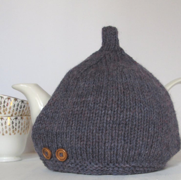 This purple heather tea cosy is hand knitted in a lovely and warm Aran wool, which comprises of 25% pure wool and 75% acrylic. It has 4 wooden buttons, 2 sewn on either side of the tea cosy, for decoration and a looped stalk at the top.