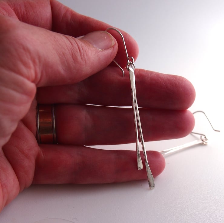 Medium length dramatic sterling silver earrings. A pair of organically shaped sticks forged and textured swing freely from the ear wire. They are made from sterling silver and the pair measure approximately 6cm and 4cm from the bottom of the hand made ear wire. A little shorter than the long ones. They are very light and comfortable to wear.