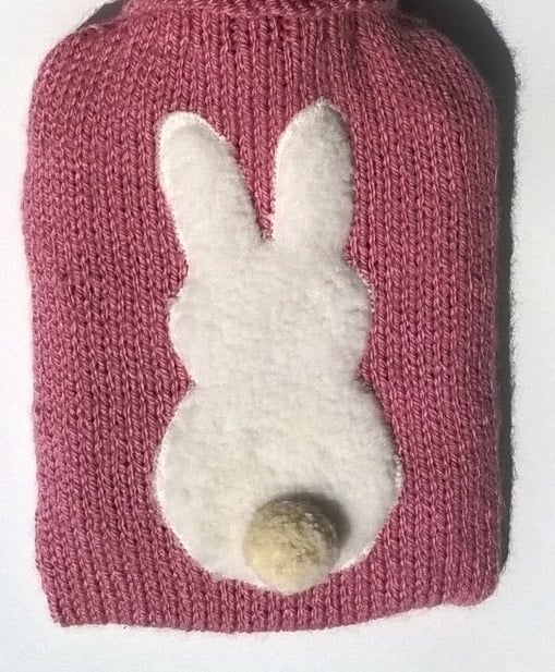 Hand knitted, rose pink hot water bottle cover, with a cream brushed wool bunny appliqued on the front, who has a very cute pompom tail on his bottom. I have designed the cover with a turn down cuff enveloping the plug area, so little fingers are discouraged from 'fiddling', yet it can be turned up for easy access to the plug for filling. The back is knitted in a chunky rib stitch for extra insulation, with an envelope style opening to remove the bottle if required.