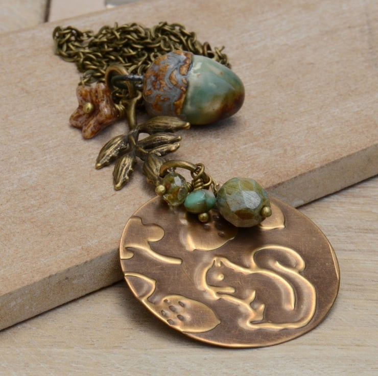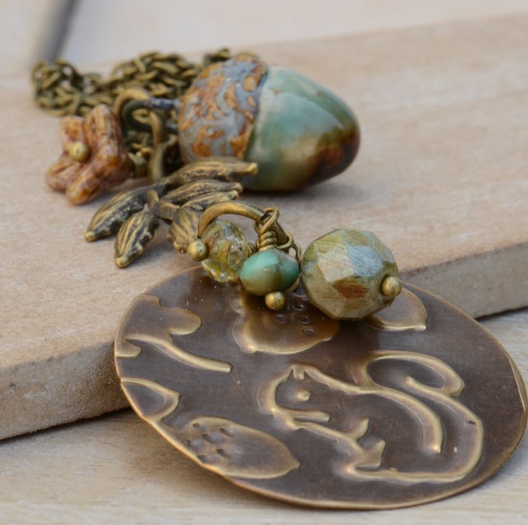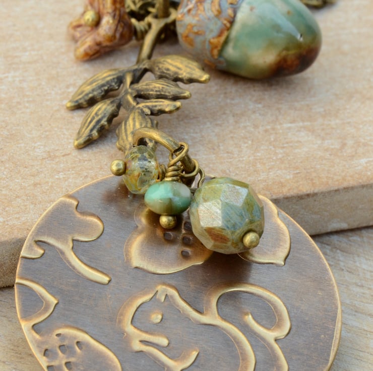 I have used a Vintaj Brass circular blank which I have embossed with a lovely squirrel woodland design and added a little ceramic acorn with a leaf connector and Czech beads in lovely shades of blue and green and a russet brown flower cup on antique bronze plated chain with trigger clasp to finish.