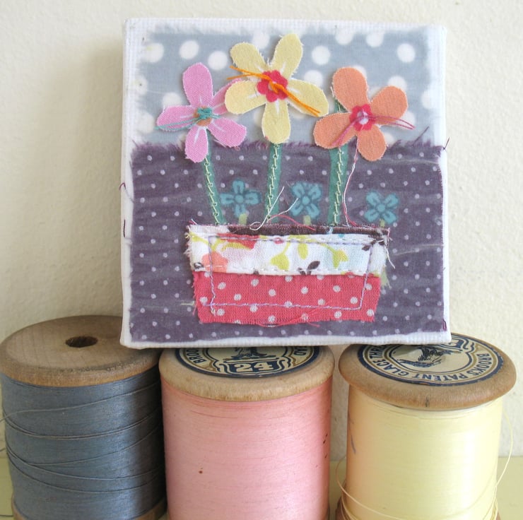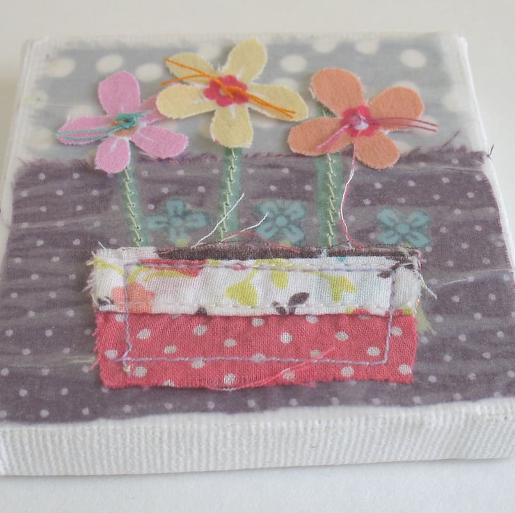 This miniature 'window box of flowers' canvas measures 7x7cm and is 1cm deep and comes with a loop for hanging.
