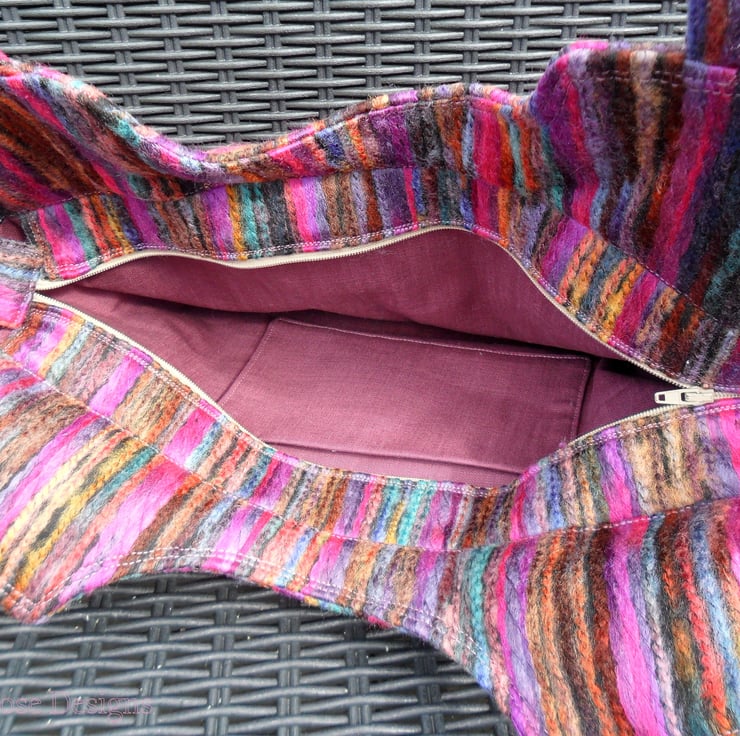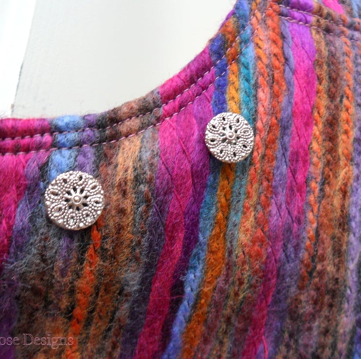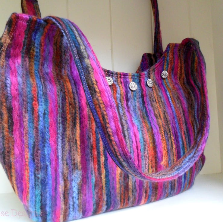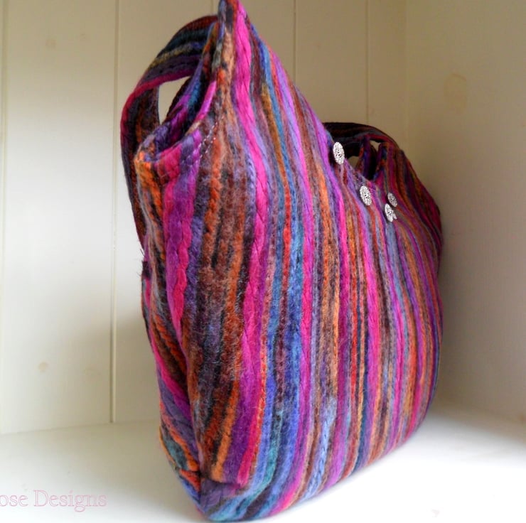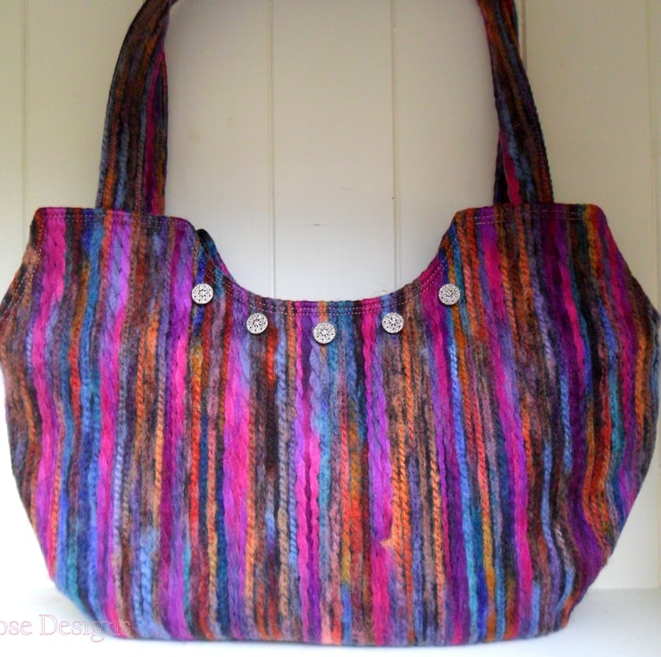 This colourful handbag has been handmade in a multi-colour striped felt fabric, it has self fabric handles and closes with a concealed zip. The cut out at the top of the bag means that when carried on the shoulder it sits snugly under the arm. The lining is a soft berry coloured cotton and there are two inner pockets; one of them is zipped. The front of the bag is trimmed with 5 filigree metal buttons.