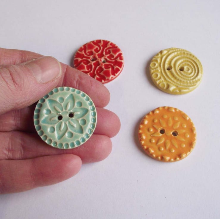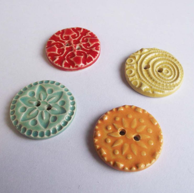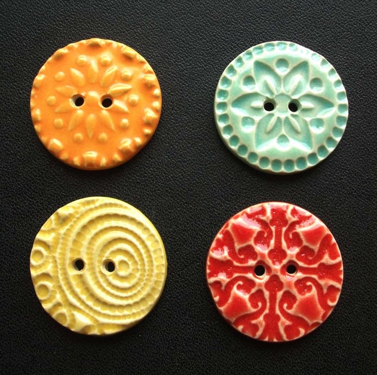 This set of four buttons are made from white earthenware clay, embossed and glazed to 1100 degrees, so nice and strong.