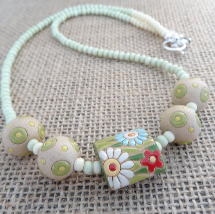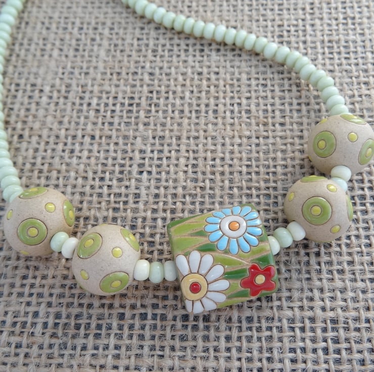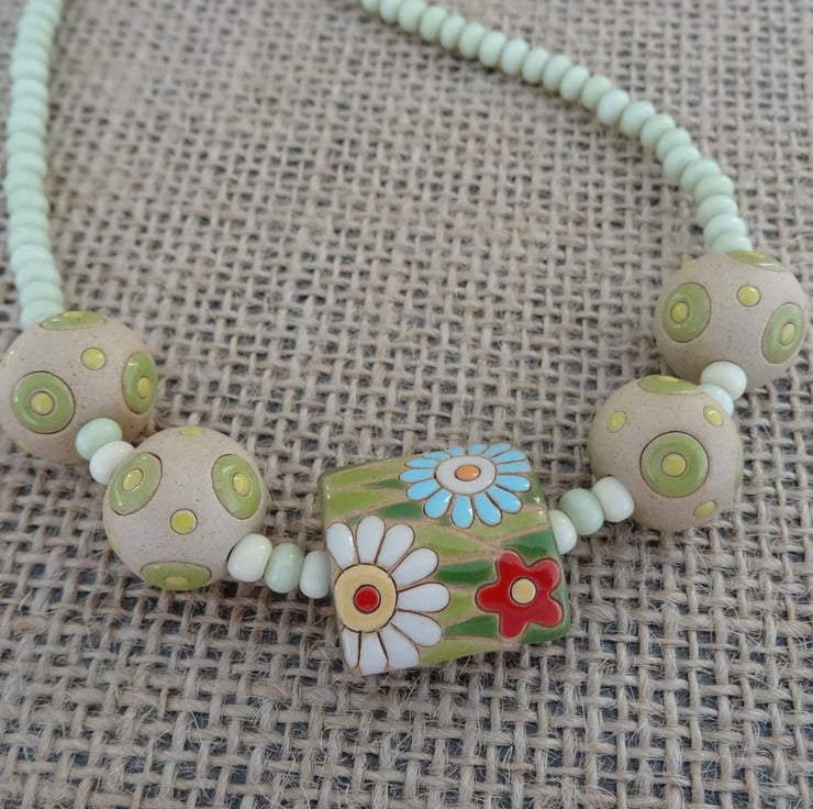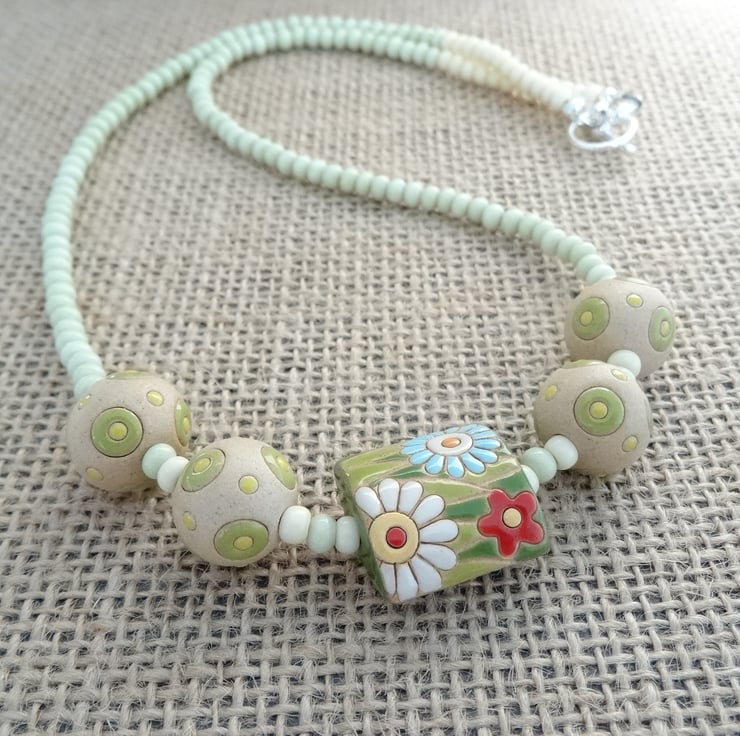 This is a lovely summery necklace made with ceramic beads. The focal bead is a 20mm x 20mm hand made by The Golem Design studio in summer meadow pattern. There are also 4 15mm ceramic round beads with a spot pattern. The upper body of the necklace is mint and cream 4mm seed beads. The colours of the necklace are cream, mint, forest green, cornflower blue and red. The length is 50cm (20") and is finished with a silver plated toggle clasp. As all of the items in my shop are unique, individual pieces made by myself, this is the necklace you will receive. It will arrive gift wrapped in tissue paper and a organza bag.