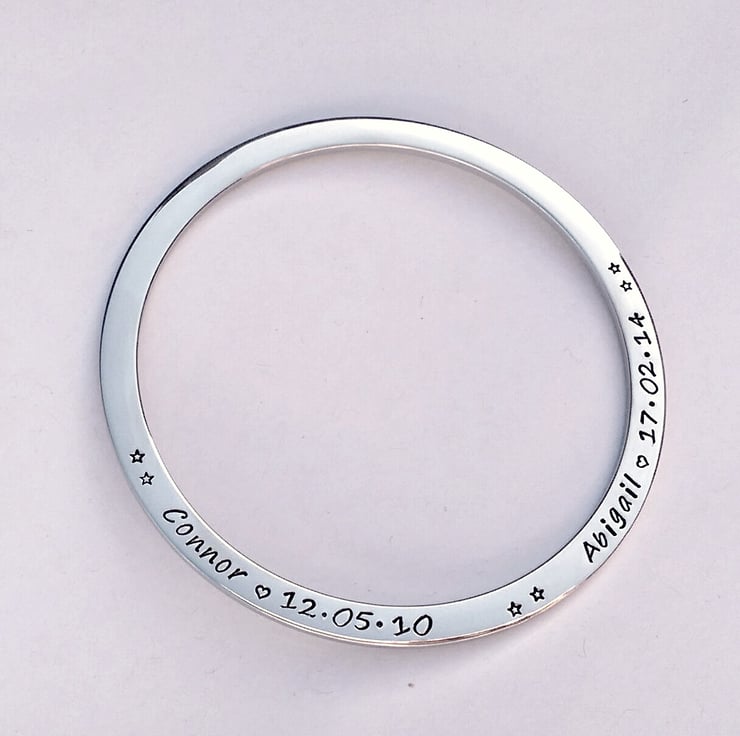 This is a lovely personalised bangle which is 2mm thick. The inside opening measures 65mm. It is stamped on the inside edge, the last photo shows how it is worn.