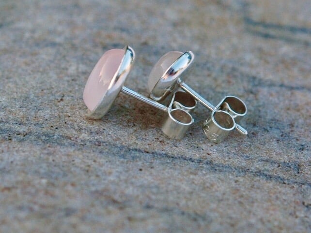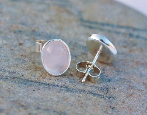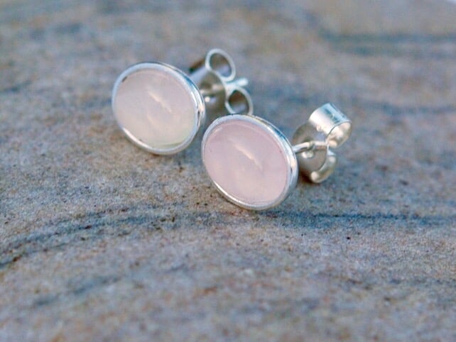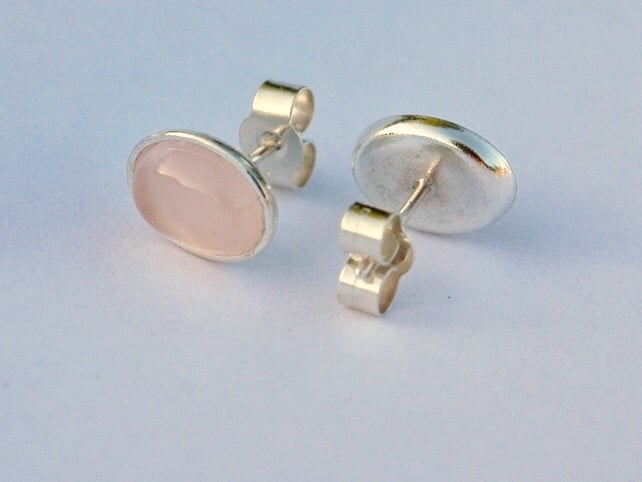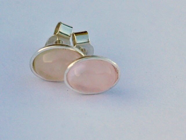These pretty stud earrings feature translucent pink rose quartz - a birthstone for October. The oval cabochons are set in 8x6mm sterling silver bezel cups with central posts which connect securely to sterling silver butterfly scrolls. Both are stamped '925' to indicate the purity of the silver. The earrings are highly polished so that they sparkle in the light.