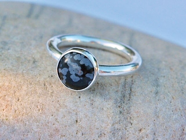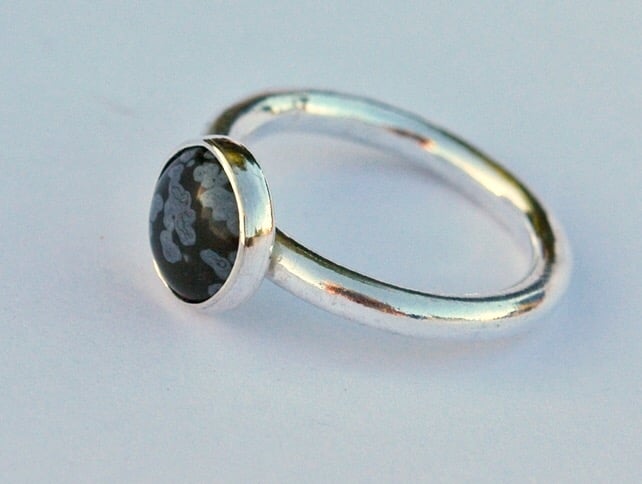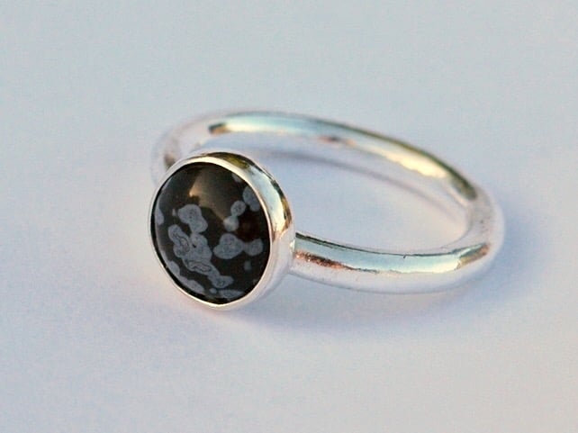 Love dark skies and swirling snowflakes? Can't wait for the ski season? This ring is for you! It is made from 3mm wide silver round wire and weighs 5.6g, giving it a very substantial feel. The stone is a round cabochon of snowflake obsidian, 10mm in diameter, a lovely glossy black in colour with grey-white flecks reminiscent of a snowstorm. The ring size currently available is UK size R so could fit a man or a lady, but I can make other sizes to order if you allow a little extra time.