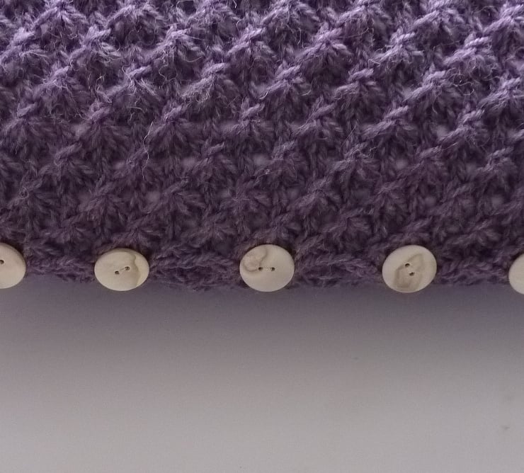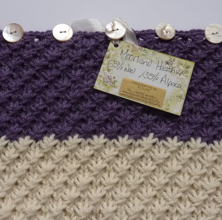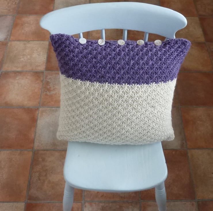 I have hand- knitted this cushion cover in a pretty, star-stitch pattern and timeless colour - block design . I've used a deliciously soft Alpaca / Wool blend yarn in a natural / cream shade and a heathery purple . Five, beautiful, Mother of Pearl buttons have been sewn to the top , which act as closures. The back and front are identical .