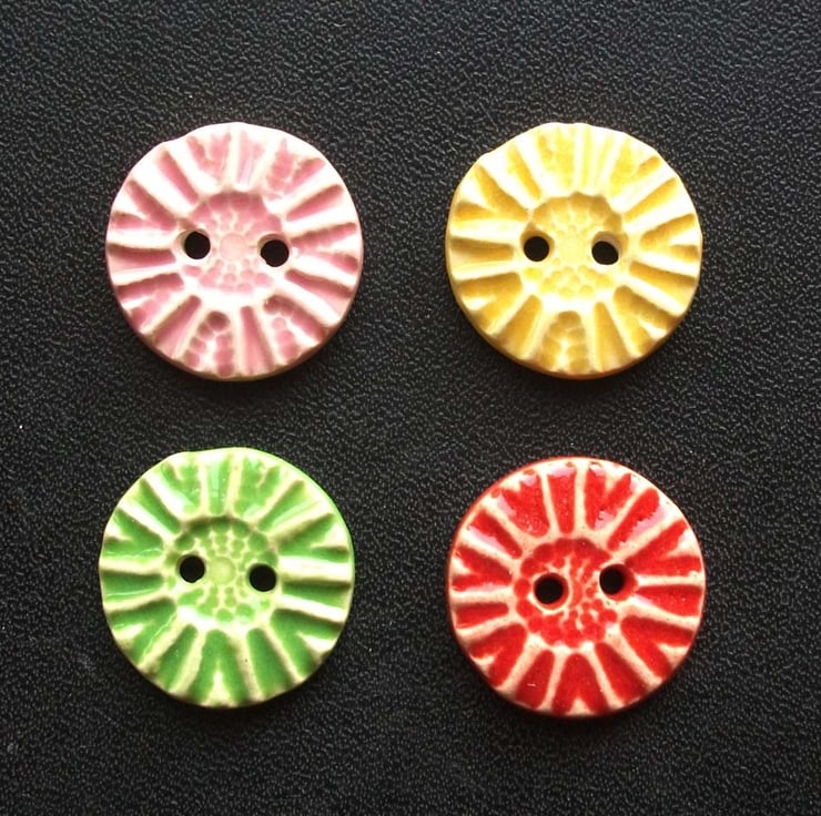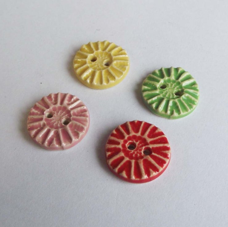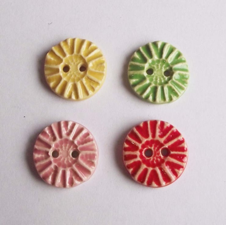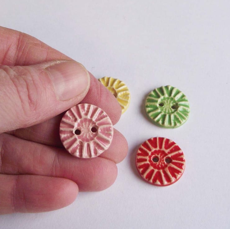 This cute little set of buttons are made from white earthenware clay and twice fired to a top temperature of 1100 degrees, so they are nice and strong.