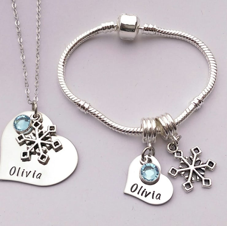 It is complemented with a silver plated charm bracelet which has a heart charm added, again stamped with the name of your choice, a tibetan silver snowflake charm and the crystal colour of your choice. (Snowflake charm shapes my vary depending on what is in stock)