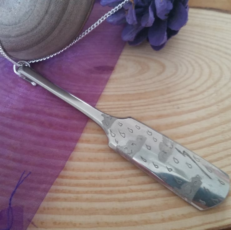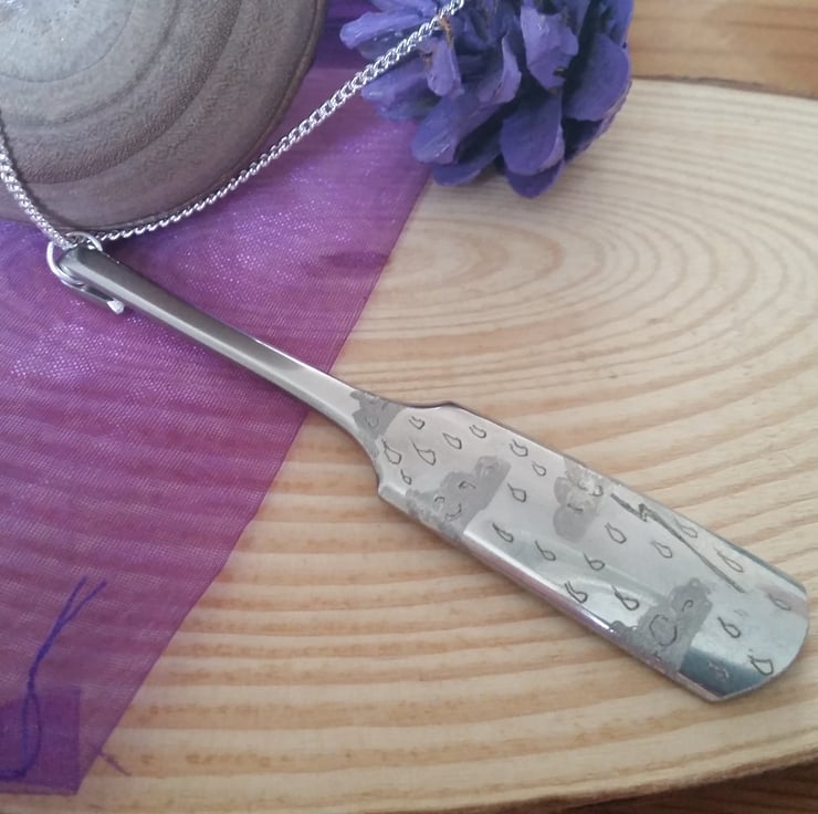 This unusual necklace has been made from the handle of an old spoon. The bowl of the spoon has been removed and the thin end of the handle bent around to form a bail. The handle has then been engraved with clouds and thunder and lightning using a carborundum stone and a dremel engraver.