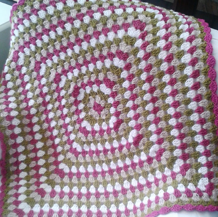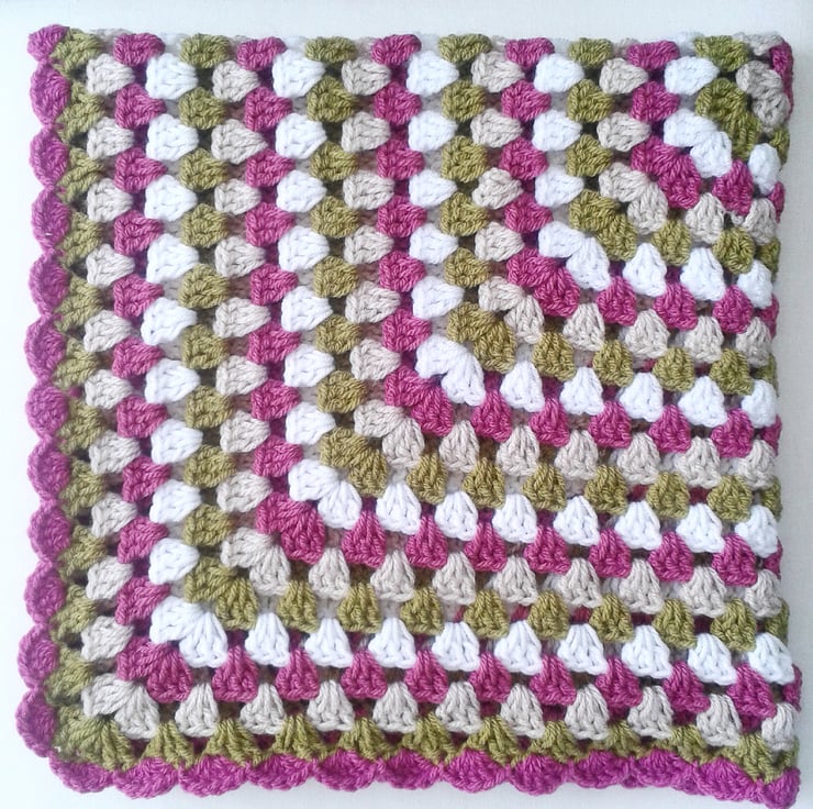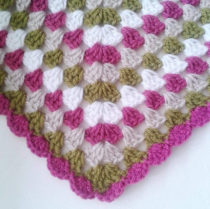 A beautiful handmade blanket in olive green, dark pink, oatmeal and white, with a pretty scalloped edging. A unique and special treat for any little girl!