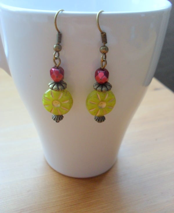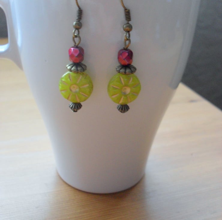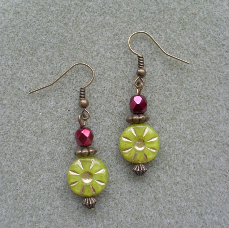 Czech starburst Glass beads in a chartreuse green colour and burgundy metallic Czech fire polish beads are attached to bronze coloured brass ear wires with some small bronze coloured metal beads