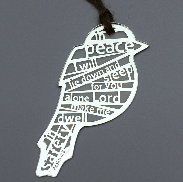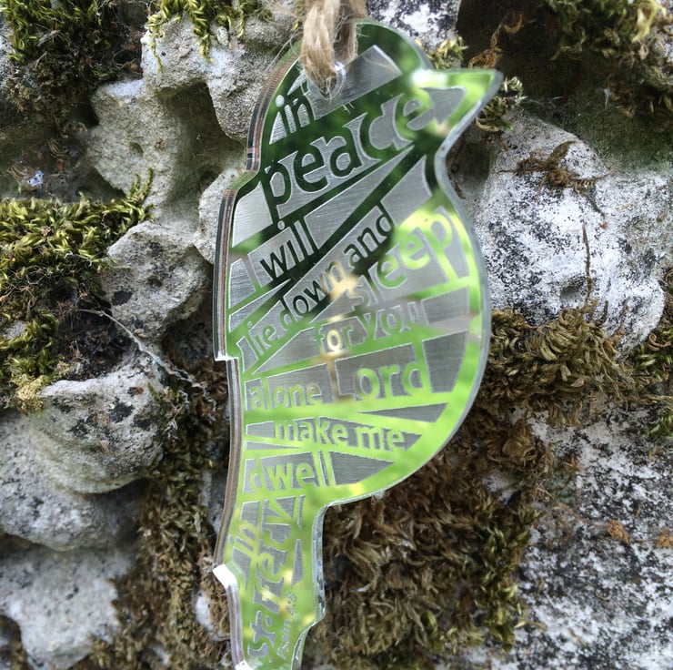 I reverse-etch my design onto the back of a sheet of mirrored acrylic, laser cut them out and attach twine. The text reads: